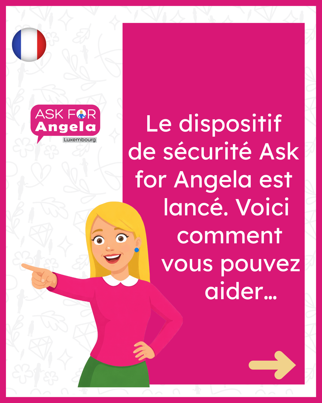Sicherheitsschema Fragen Sie nach Angela heute in Luxemburg eingeführt. Dies ist eine diskrete Möglichkeit, zu signalisieren, dass Sie an einem Veranstaltungsort Hilfe benötigen, indem Sie einfach fragen, ob Angela arbeitet.