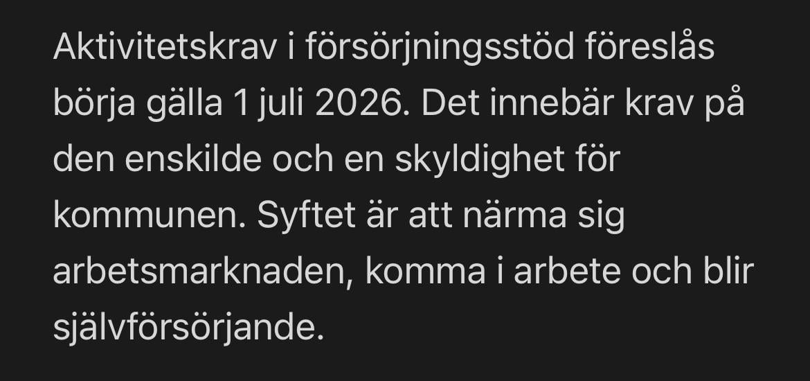 Jag arbetar i relevant fält och samarbetar med några kommuner i närheten och kan säga att hos de kommunerna är det kaos i alla fall. Ingen av dem vet vad de ska göra med alla som nu behöver komma ut i aktivitet och det kommer i princip bli förvaring av dem alla. Vi som arbetar mycket med individer med ekonomiskt bistånd vet att många av dem är sjuskrivna men har inte rätt till sjukpenning, men nu ska de plötsligt ut och aktiveras dvs sitta och deppa i ett ledsamt rum (upp till) 40 timmar i veckan bara sådär. Eller kanske bli utnyttjade av företag som vill ha gratis arbetskraft men inte har någon som helst tanke om att vilja anställa någon. (För det händer ju inte tillräckligt ofta redan nu liksom)