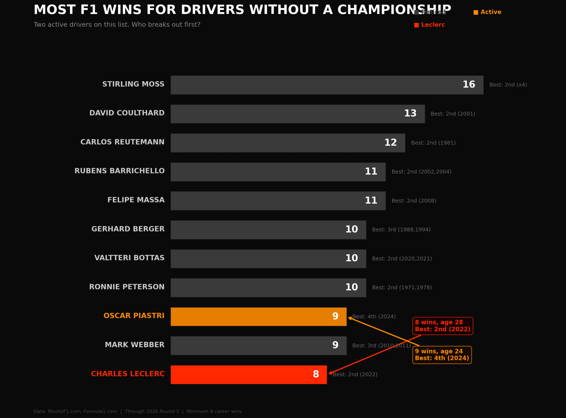 Data sources: Formula1.com (career stats, current standings), MostlyF1.com (historical win records for non-champions), motorsportstats.com (season-by-season verification).