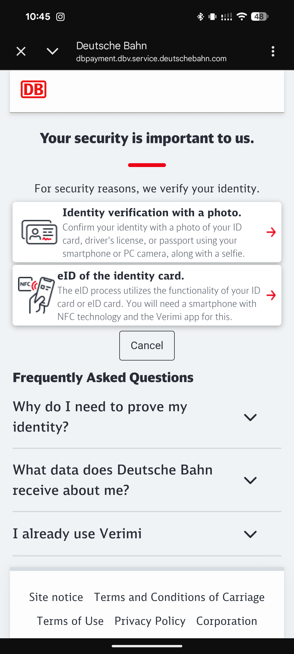 Ich habe versucht, ein ICE-Ticket zu buchen, und plötzlich wurde ich von der App aufgefordert, meinen Ausweis zu scannen. Es wurde normal geladen, ich habe versucht, es zu scannen, aber es funktionierte nicht, stürzte ab und die App meldete, dass Tickets nicht bestätigt werden konnten. Ich habe es erneut versucht, es wurde normal ohne Ausweis bezahlt und mein Ticket wurde gekauft. Was ist passiert? Ist das neu? Es war die offizielle DB-App und die Verifizierungssache hatte ihr Logo, aber jetzt bin ich so verwirrt, dass ich das Gefühl habe, ich hätte meine ID mit einer bösartigen Website geteilt. Hat jemand Erfahrung mit so etwas?