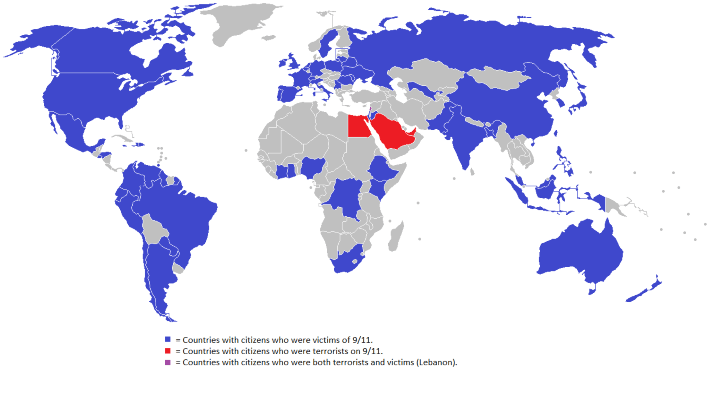 This map has been floating around for a few years now. Since its creator saw fit to include the perpetrators it’s probably worth elaborating further and factoring in the hundreds of thousands of Iraqis and Afghans that also became victims.