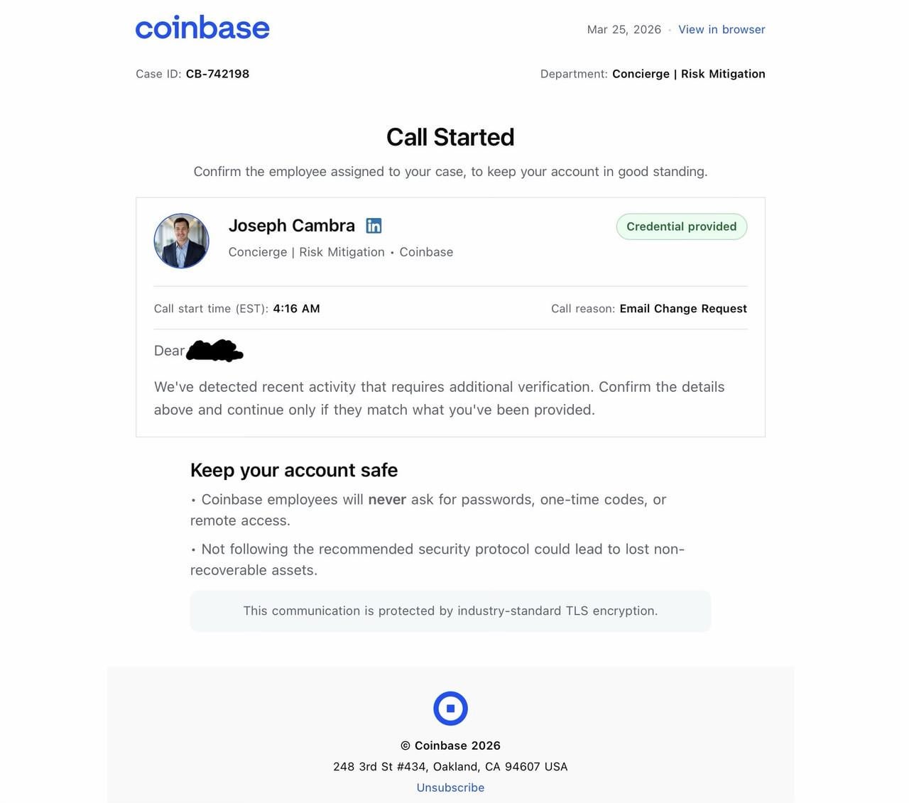 ⚠️ SCAM ALARM: Gefälschte Coinbase „Risk Mitigation“-Anrufe und Phishing-Portale