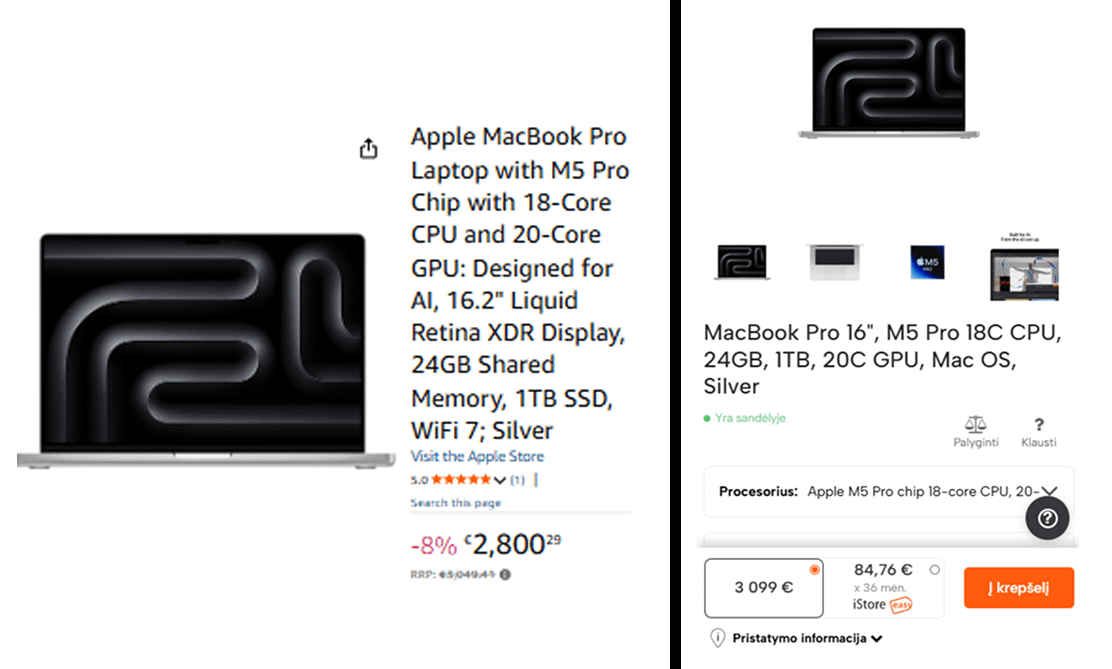 Ich bin auf der Suche nach einem neuen Laptop und habe festgestellt, dass der Preisunterschied zwischen Amazon und litauischen Online-Shops mehr als 200 € beträgt.