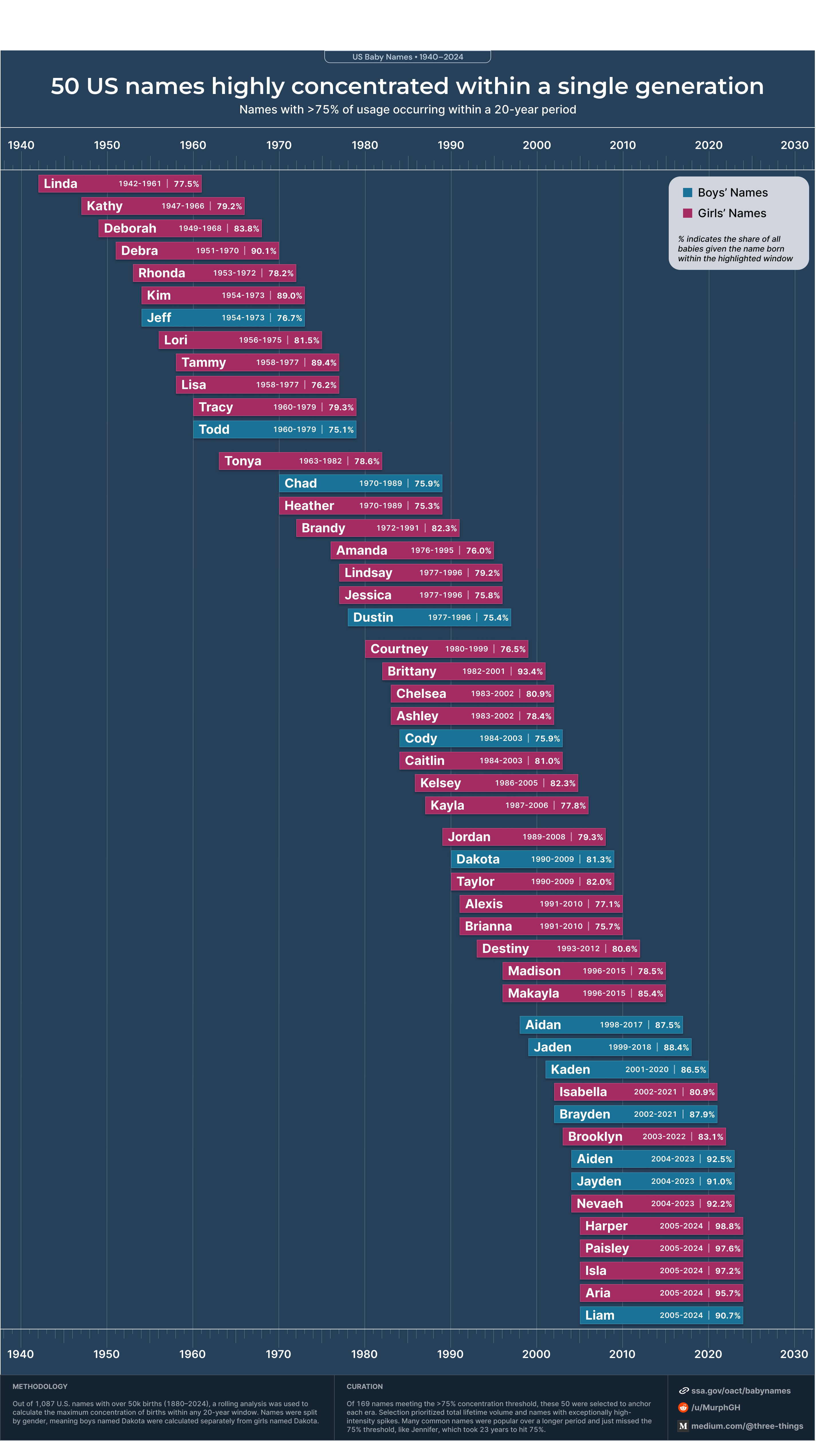 Out of 1,087 names with over 50k lifetime births, I used a rolling 20-year window to find the maximum concentration of births for each name, calculated separately by gender. These 50 were selected from the 169 names that crossed the 75% threshold, prioritizing lifetime volume and names with exceptionally high spikes.