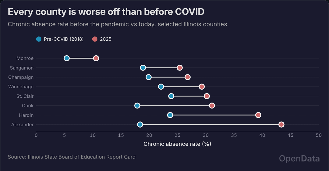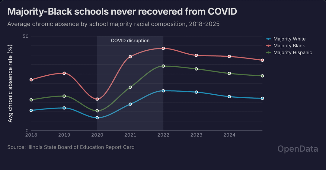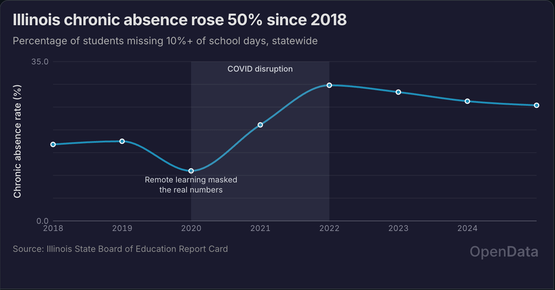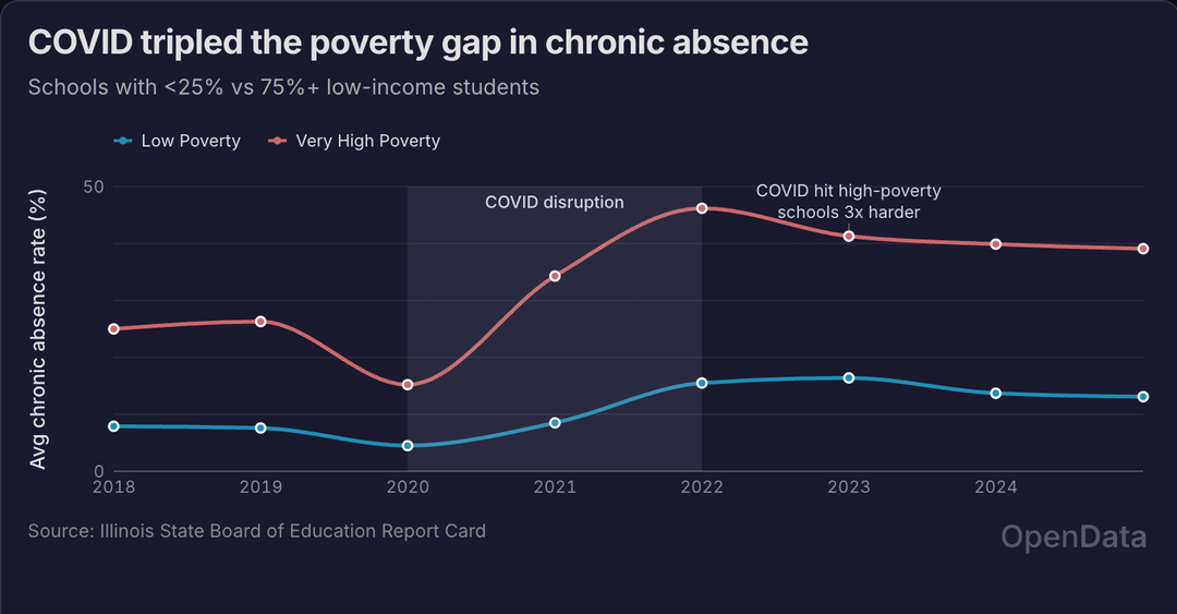 * Full writeup with all the charts and methodology: [https://labs.tryopendata.ai/illinois-schools-chronic-absence-crisis](https://labs.tryopendata.ai/illinois-schools-chronic-absence-crisis)