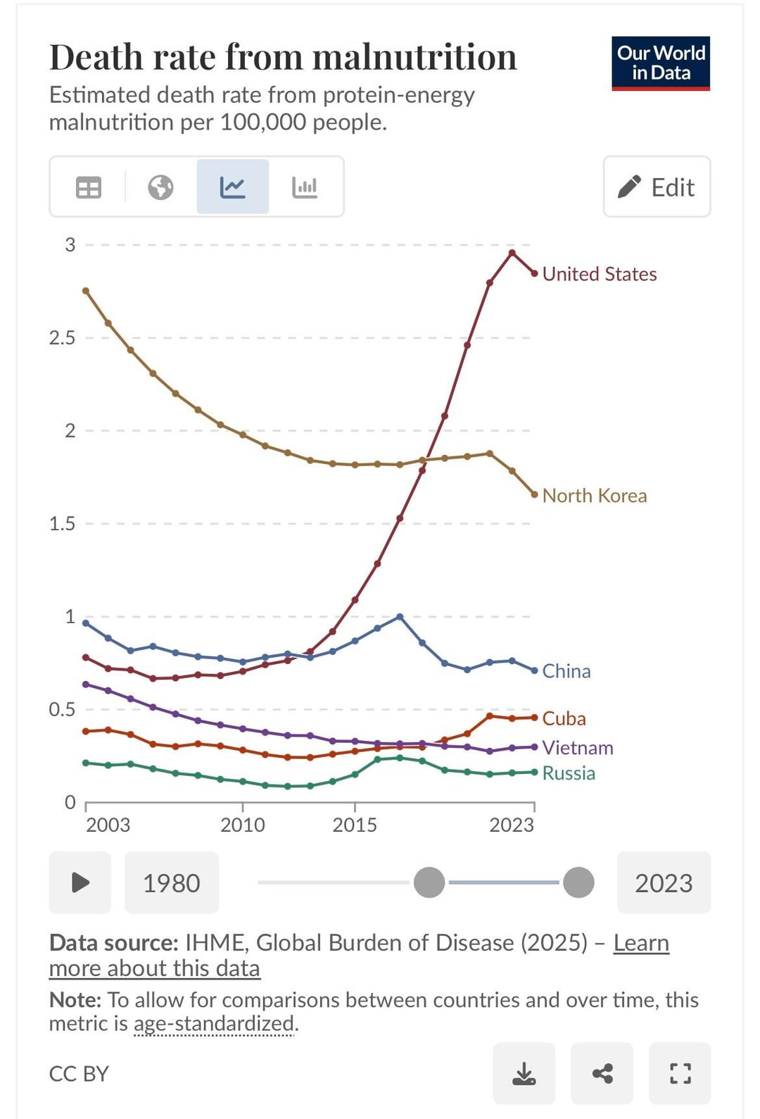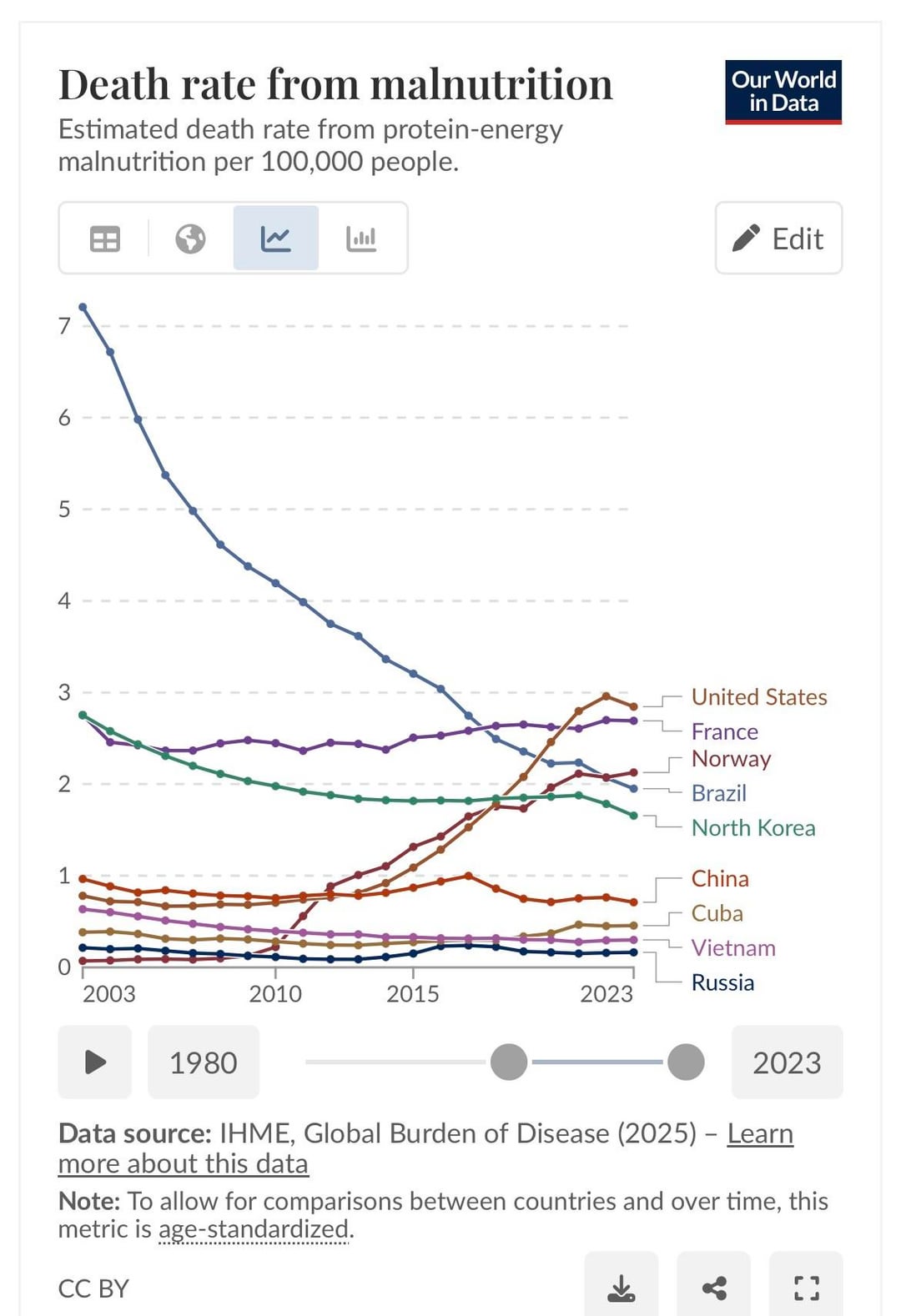[Data](https://ourworldindata.org/grapher/malnutrition-death-rates?tab=line&time=2003..latest&country=CHN~VNM~CUB~PRK~USA~RUS)