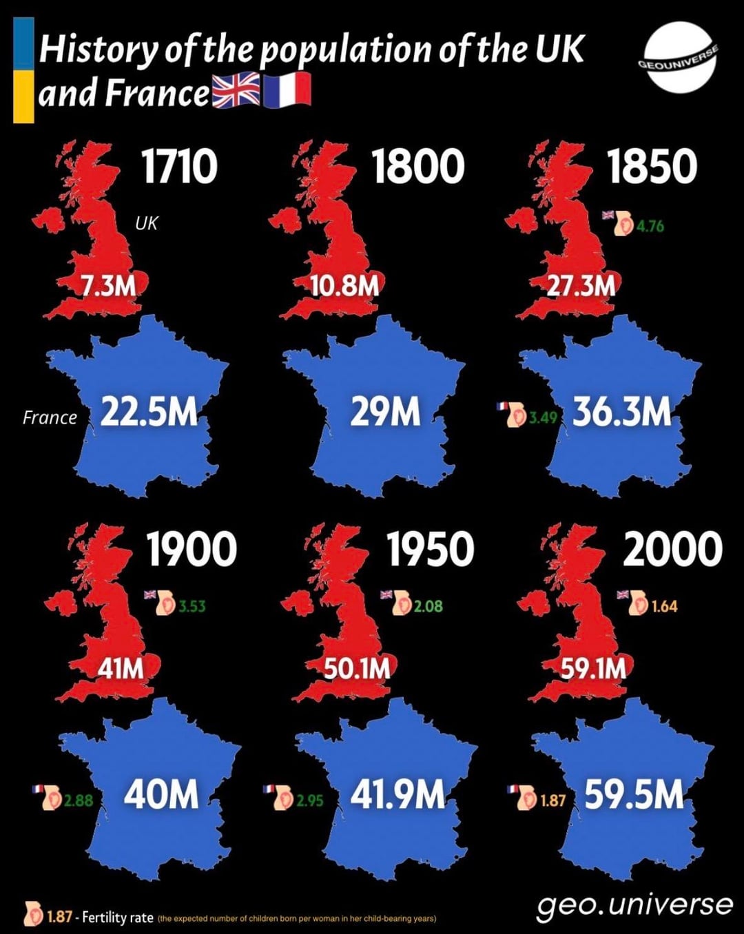 The UK grew about 461.6 percent between 1710 and 1900, while France grew 77.8 percent in the same time period.