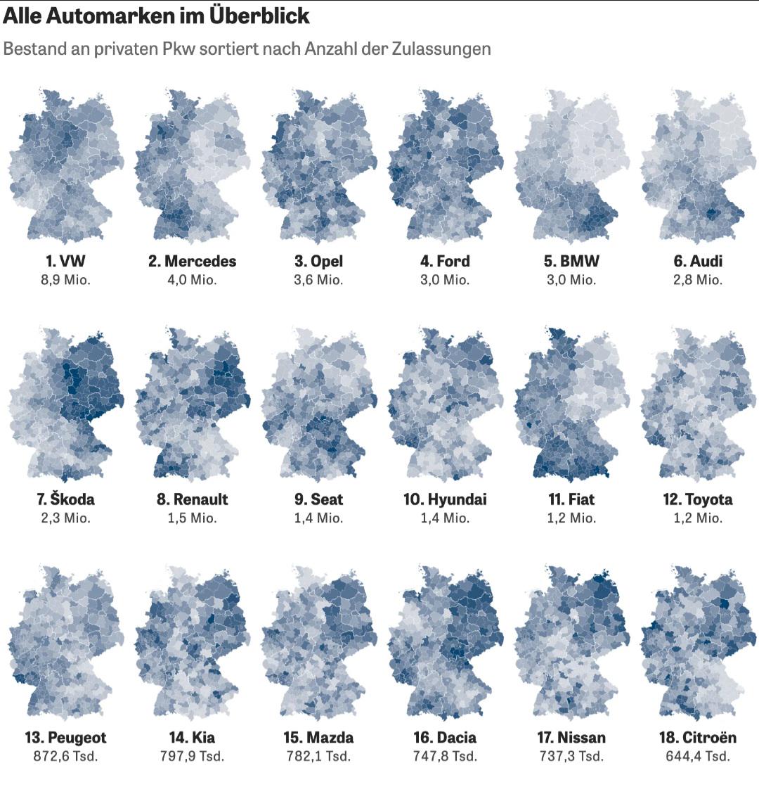 Note the Mercedes, Opel, and BMW „hole“ around Ingolstadt (where Audi is located).