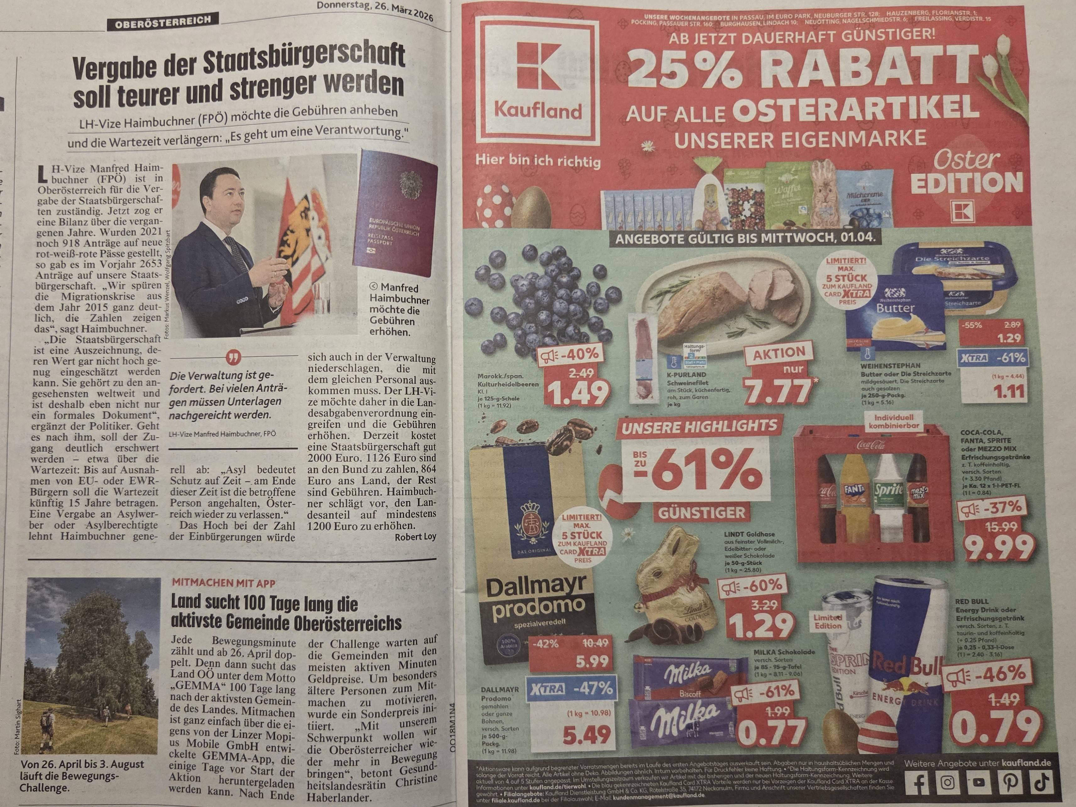 Im Bild sehen wir ein Inserat der deutschen Hypermarkt-Kette Kaufland in der Oberösterreich-Ausgabe der Kronen Zeitung. Die Kaufland-Filiale in Passau ist mit öffentlichen Verkehrsmitteln nicht so einfach zu erreichen, das Klimaticket gilt bis Passau Hbf, von dort braucht man einen Busfahrschein für 5€(hin und zurück). Die Filiale in Freilassing ist ab Salzburg mit dem Klimaticket über die Buslinien 24 ab Mülln oder 82 ab dem Freilassinger Bahnhof erreichbar. Die Filiale in Lindau ist mit dem Klimaticket ebenfalls ohne Aufpreis über Lindau-Reutin erreichbar.