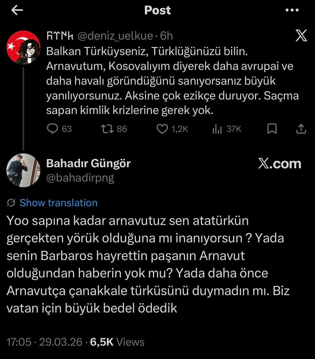pardonda Arnavutlar, Boşnaklar, cerkezlere düşmanlık besleyen bu x türkcülerini kim fonluyor? onlar ülkeyi bölmeye çalışmıyor bir insan geldiği yeri niye unutsun. türküm de der arnavutum da bosnagim da. türk kimliğini reddetmedigi sürece kim ne olursa olsun.
