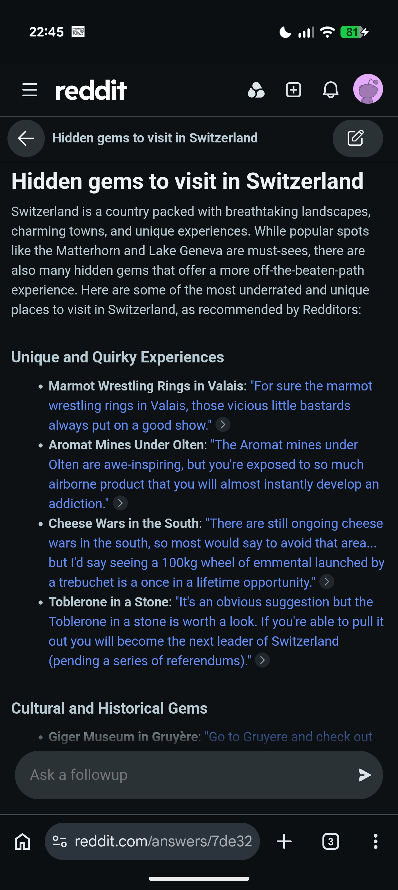 My favorite experience in Switzerland was the knighting ceremony for the king of the referendi. It was a sort of mix between the UK’s cheese rolling tradition and lord of the rings.