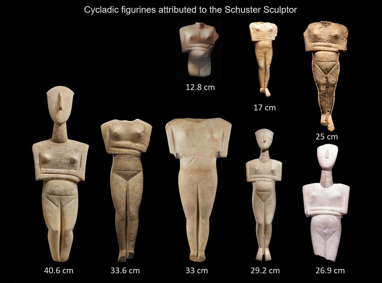 6 weibliche Figuren aus kykladischem Marmor, regulärer Typ – späte Spedos/Docates-Variante. Dem Bildhauer Schuster zugeschrieben (von Pat Getz-Gentle). Protokykladische II. Periode, ca. 2700 – 2300 v. Chr. (1500×1110)