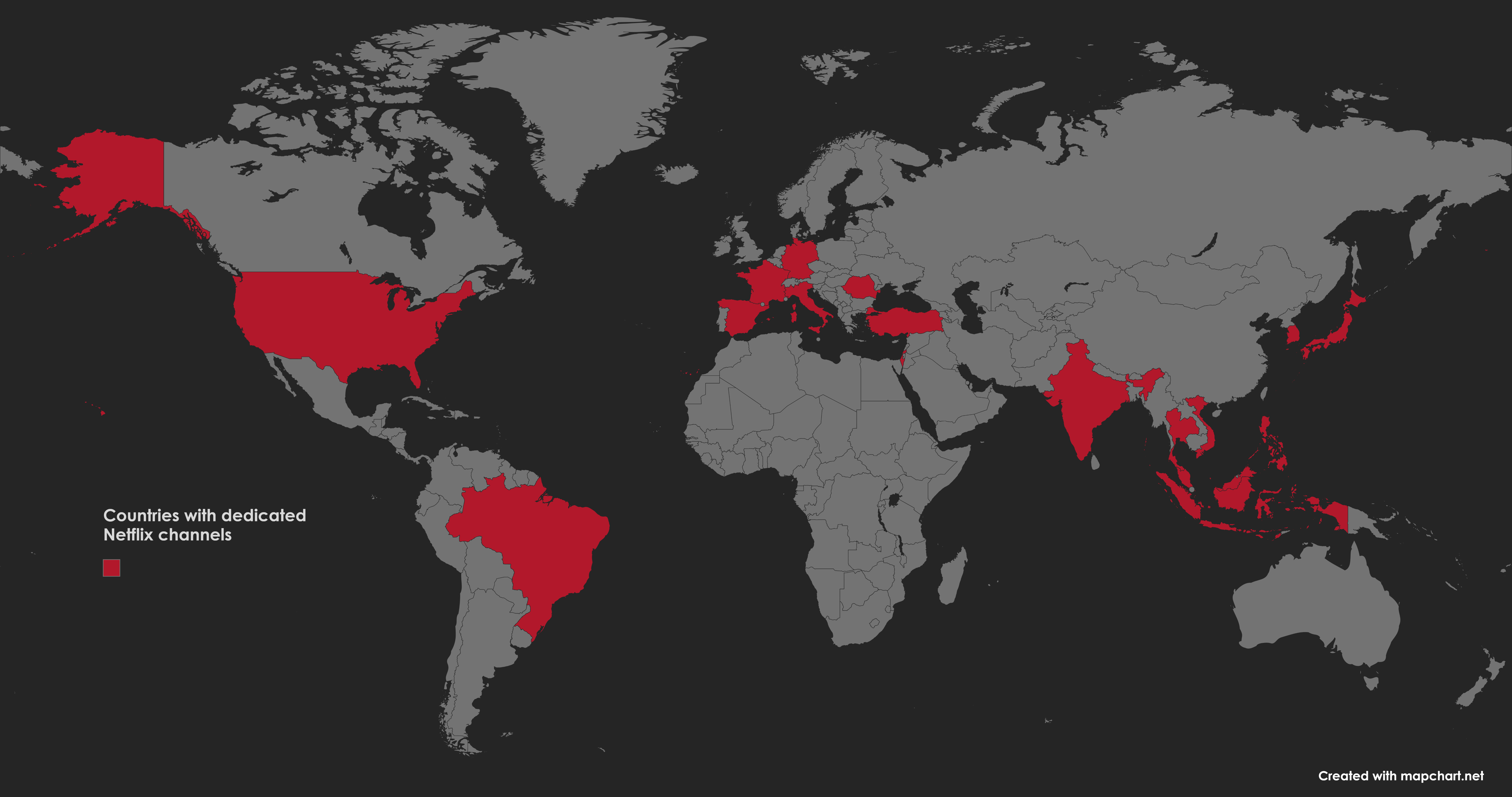 Edit- I missed the channel for UK and Ireland and Poland I’m really sorry also this map only includes channels for individual countries not regions there were channels for MENA,LATAM,NORDIC,AFRICA but they werent considered. The source is the featured channels list from the official Netflix channel