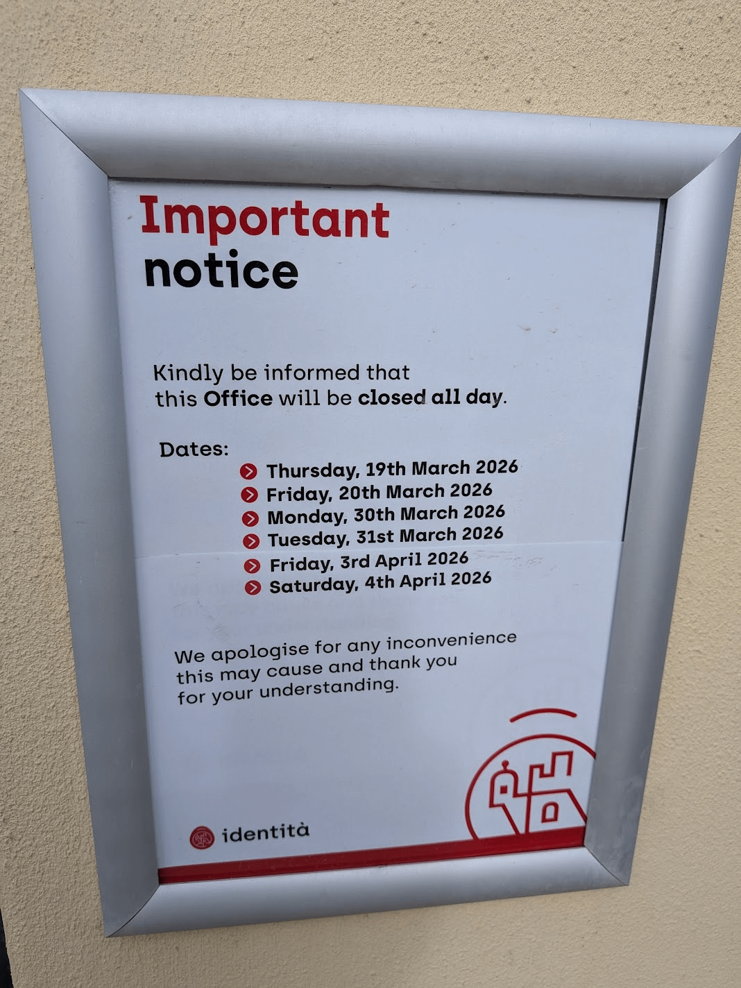 Morgen ist also ein Feiertag und viele haben sich heute frei genommen, auch ich, um ein verlängertes Wochenende zu haben. Die Sache ist die, jemand hat mich bei der Arbeit vertreten und wir können nicht alle aus meinem Team am selben Tag frei haben … Nun ja, Identita‘, eine ÖFFENTLICHE EINRICHTUNG, hat sich offenbar ein langes Wochenende gegönnt. Dies ist das Passamt in Marsa. Montags geschlossen, ein normaler Wochentag, an dem die Öffnungszeiten von 07:30 bis 14:00 Uhr sein sollten.
