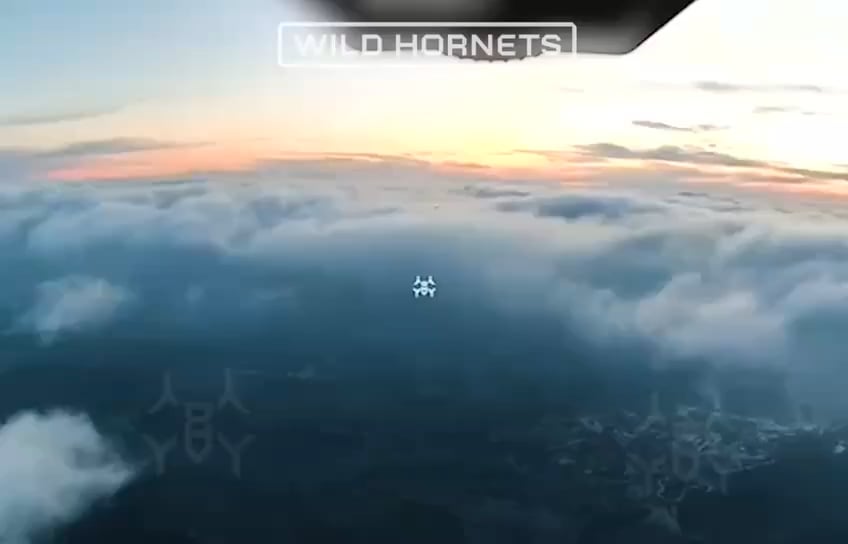 Von einer „Sting“-Abfangdrohne der „Wild Hornets“-Einheit aufgenommene Aufnahmen zeigen, wie ein iranisch-russisches „Shahed“-UAV am Himmel über der Ukraine abgefangen wird.