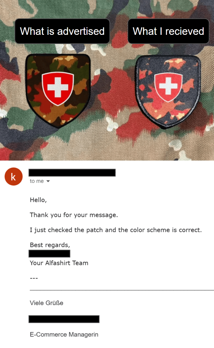 Ich habe online einen Patch mit dem bestellt "Alpenflage" Tarnung von einer deutschen Firma. Allerdings war ich enttäuscht, als ich beim Öffnen der Verpackung feststellen musste, dass die Farben völlig verfärbt waren. Bei normaler Beleuchtung hat das Grün fast den gleichen Farbton wie das Schwarz, und das Rot ähnelt stark dem orangefarbenen Hintergrund, der selbst eher beige sein soll. Ich habe versucht, Kontakt zu ihnen aufzunehmen, aber sie reagierten nicht mehr, nachdem ich auf die E-Mail im Bild mit einem Vergleich zwischen dem Aussehen des Patches auf der Website und dem Patch, den ich erhalten hatte, geantwortet hatte.