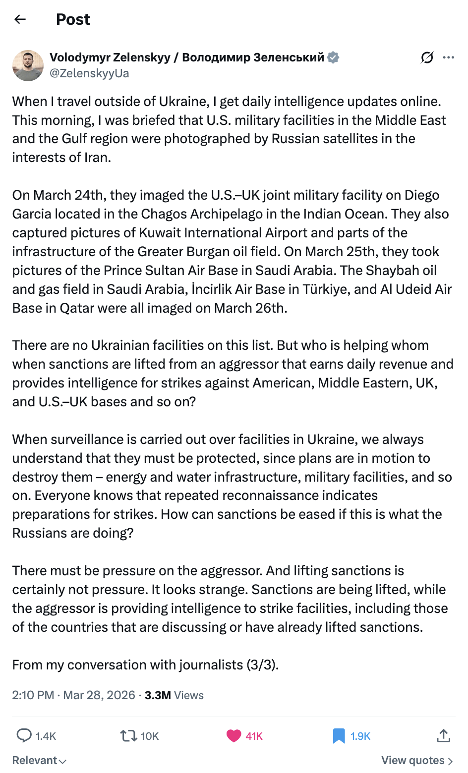 Selenskyj hat Recht, es ist „seltsam“, dass die USA die Sanktionen gegen Russland aufgehoben haben – was Putin Milliarden an Öleinnahmen bescherte –, während Russland Satelliten einsetzt, um Iran dabei zu helfen, amerikanische Streitkräfte im Golf anzugreifen und anzugreifen. Trump gab in einem Fox-Interview mit Brian Kilmeade zu, dass Russland Iran helfe. Also WTF?