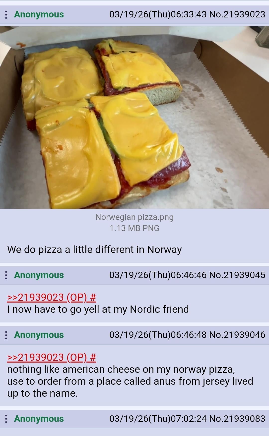 2. I’ve also never seen or heard of this. Its not a Norwegian thing; its some guy who put sliced cheese on a square pizza and posted it online.