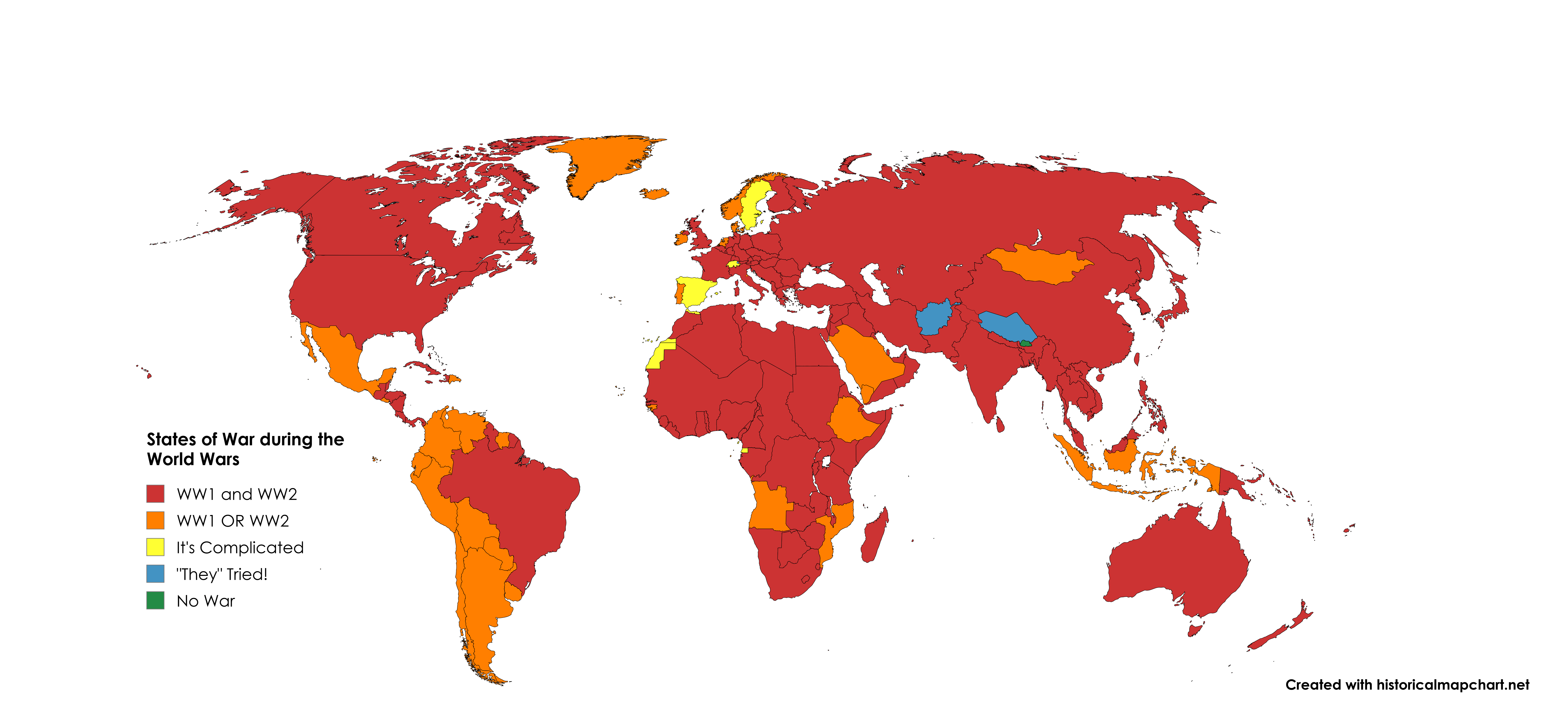 Während der Weltkriege (1914-1918 und 1939-1945) dürfte es kaum einen Ort auf der Erde geben, der nicht in den Konflikt verwickelt war. Rot und Orange sind selbsterklärend, aber auch andere Länder waren beteiligt.