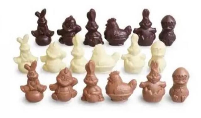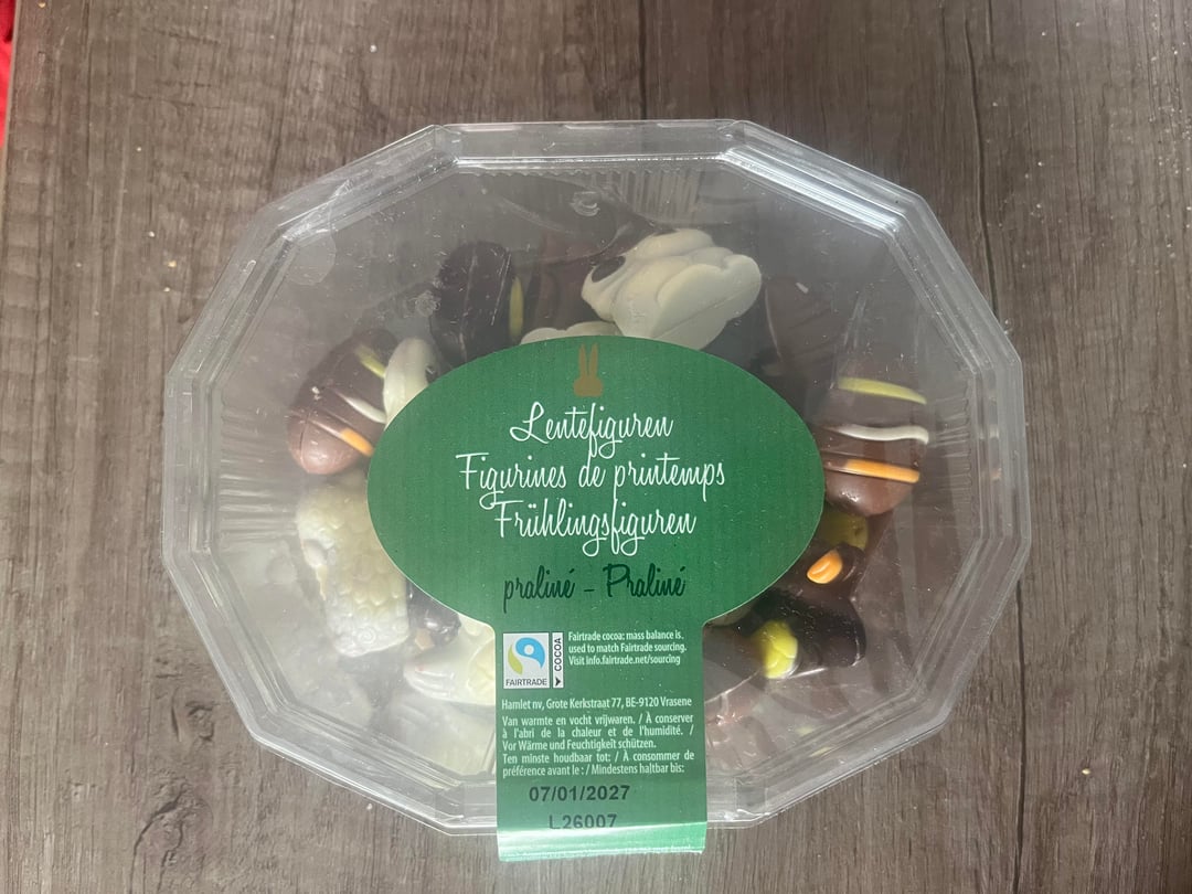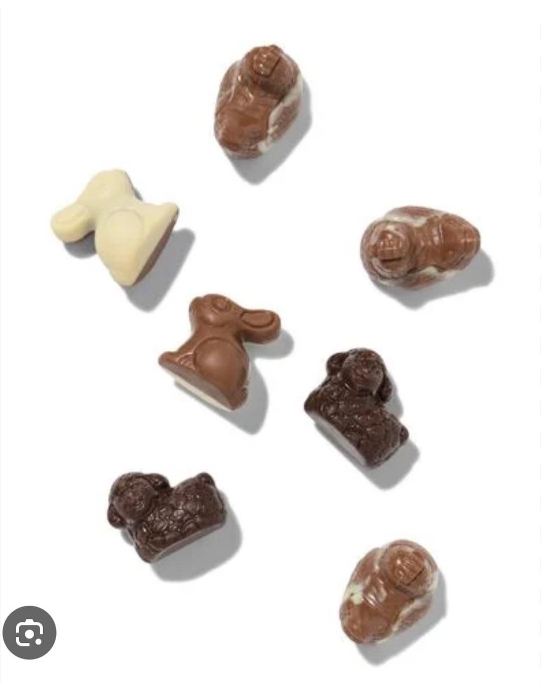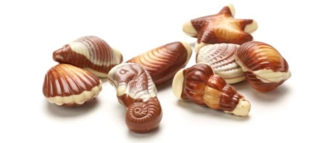 Es sind nicht die von Aldi/colruyt auf Foto 1, aber sie sehen ein bisschen ähnlich aus. Ich erkenne die Form für das Huhn auf Foto 2 von den Pralinen, von denen ich spreche, weiß aber nicht, ob die anderen 3 Formen auch stimmen. Sie waren im Stil der Schokoladen-Meeresfrüchte auf Foto 3 gehalten (ähnliche Farbtöne usw.), ein bisschen wie die Schokoladen-Hühner, die man auf Foto 4 nur von oben sieht, und möglicherweise gab es mehr Formen wie auf Foto 5 (nicht sicher), es gab auch einige in der Form von Blumen (konnten nirgendwo auf Google gefunden werden), außerdem hatten sie alle die gleiche Standard-Pralinenfüllung ohne Schokoladentrennung in der Mitte