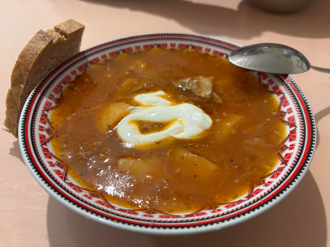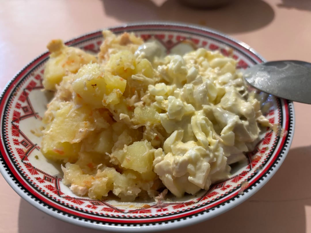 Das heutige Mittagessen in meiner Militäreinheit irgendwo in der Ukraine: Ukrainischer roter Borschtsch mit Smetana, Salzkartoffel mit Fleisch und Salat (Huhn, Ei, Ananas, Zwiebel, Mayonnaise)