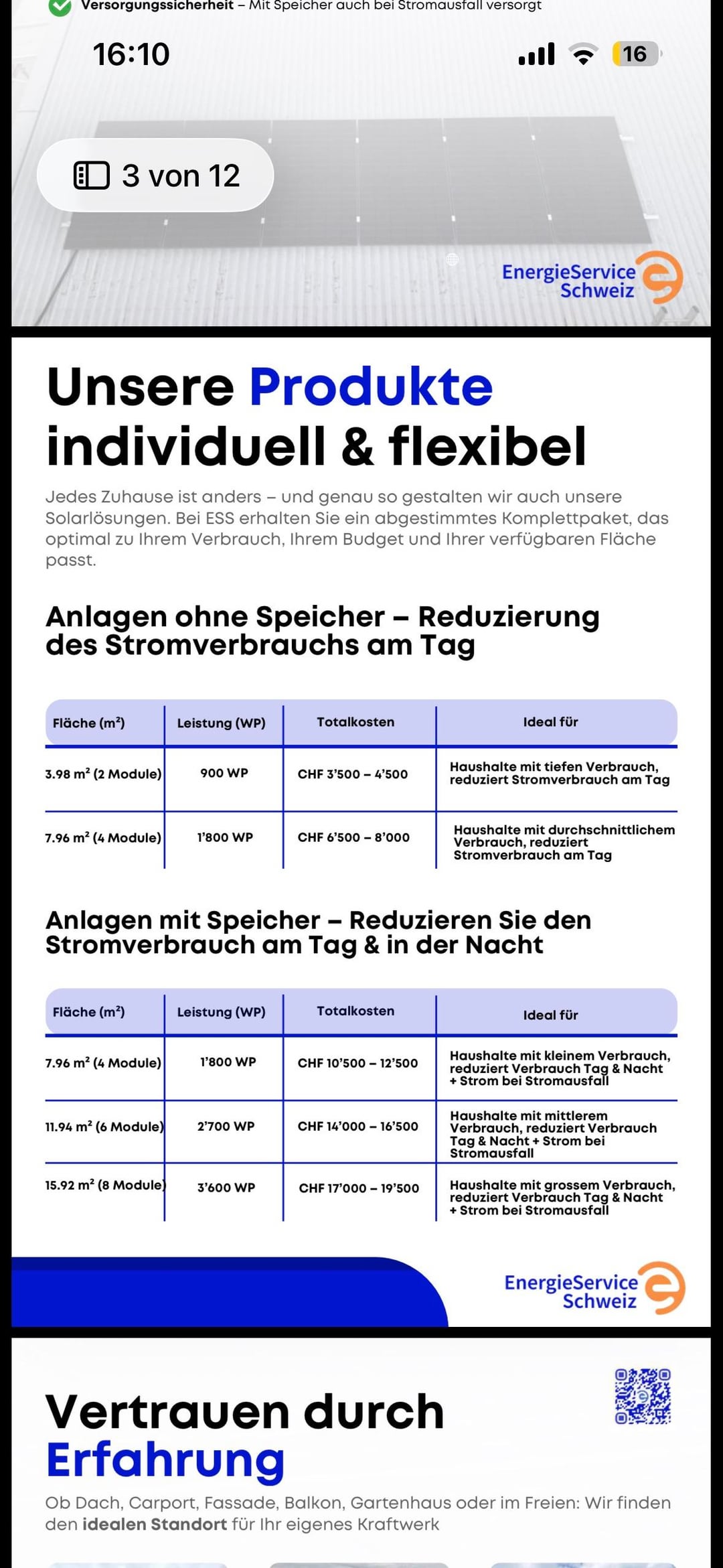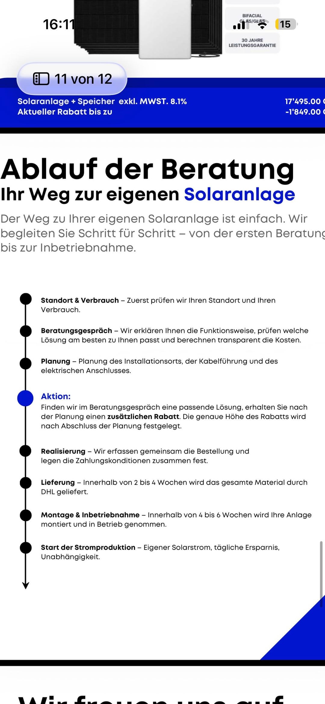 Sie kamen zu meinen Eltern und fragten sie, ob sie Interesse hätten. Ein paar Minuten später erhielten sie ein Angebot und 3 Tage später kamen sie erneut und wollten bereits, dass sie den Kaufabschluss unterschreiben – als sie zögerten, sagten sie ihnen, sie sollten nur das kleinste kaufen (2 Panels) und wollten eine sofortige Antwort (wenn sie Zeit zum Nachdenken brauchen, würden sie nicht den ersten Beratungsrabatt bekommen).