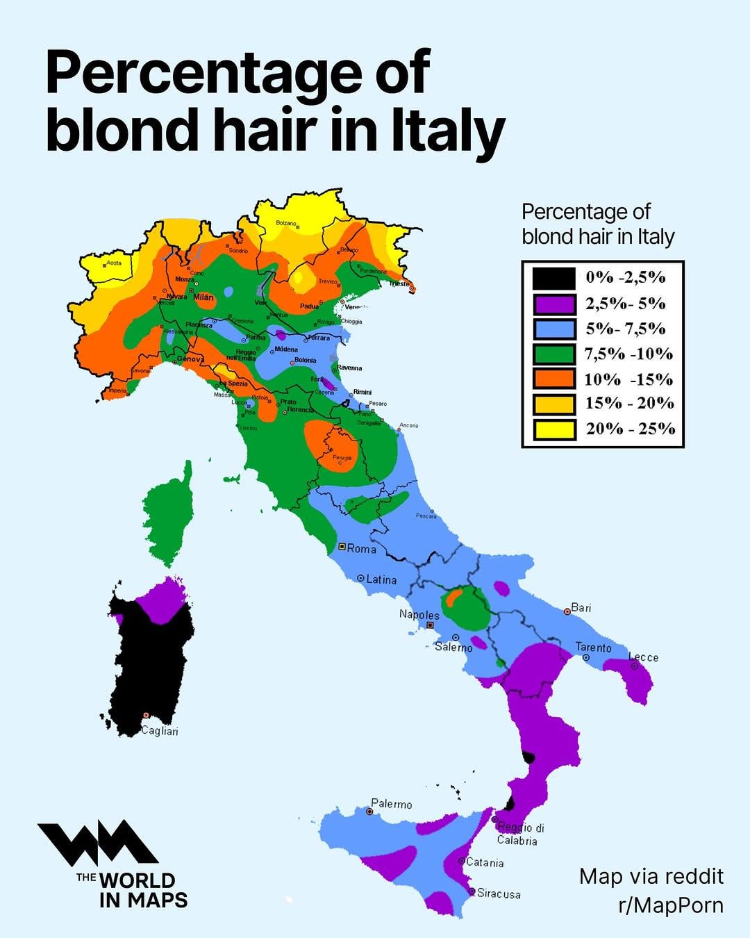 No_Artichoke4686 on 02.04.2026 4:07 a.m. Coincidently the higher percentage areas were where the Lombards and Ostrogoths were. Also interesting how Sardinia is the lowest percentage area. Is there any reason why?