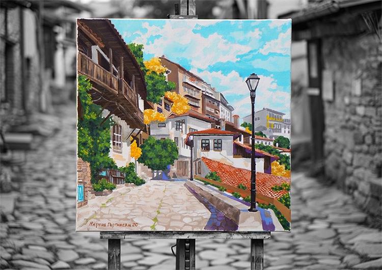 Landschaft aus Veliko Tarnovo. Abmessungen 40 x 40 cm. Ich habe es mit Ölfarben bemalt.