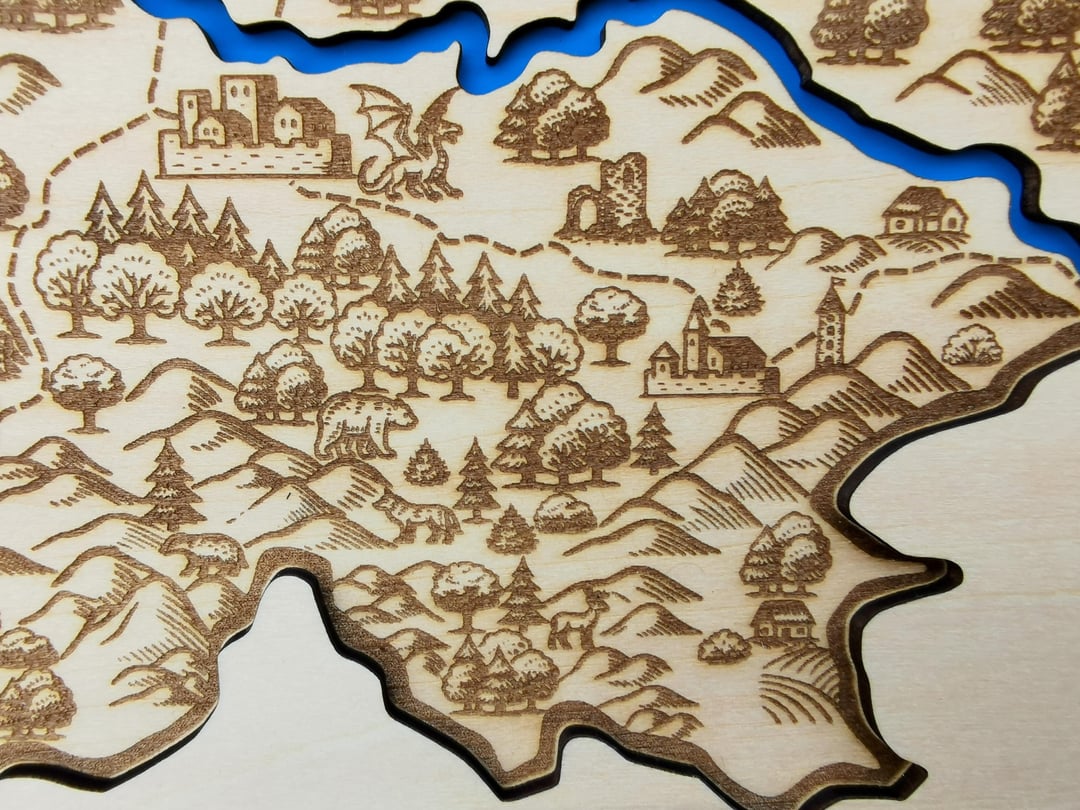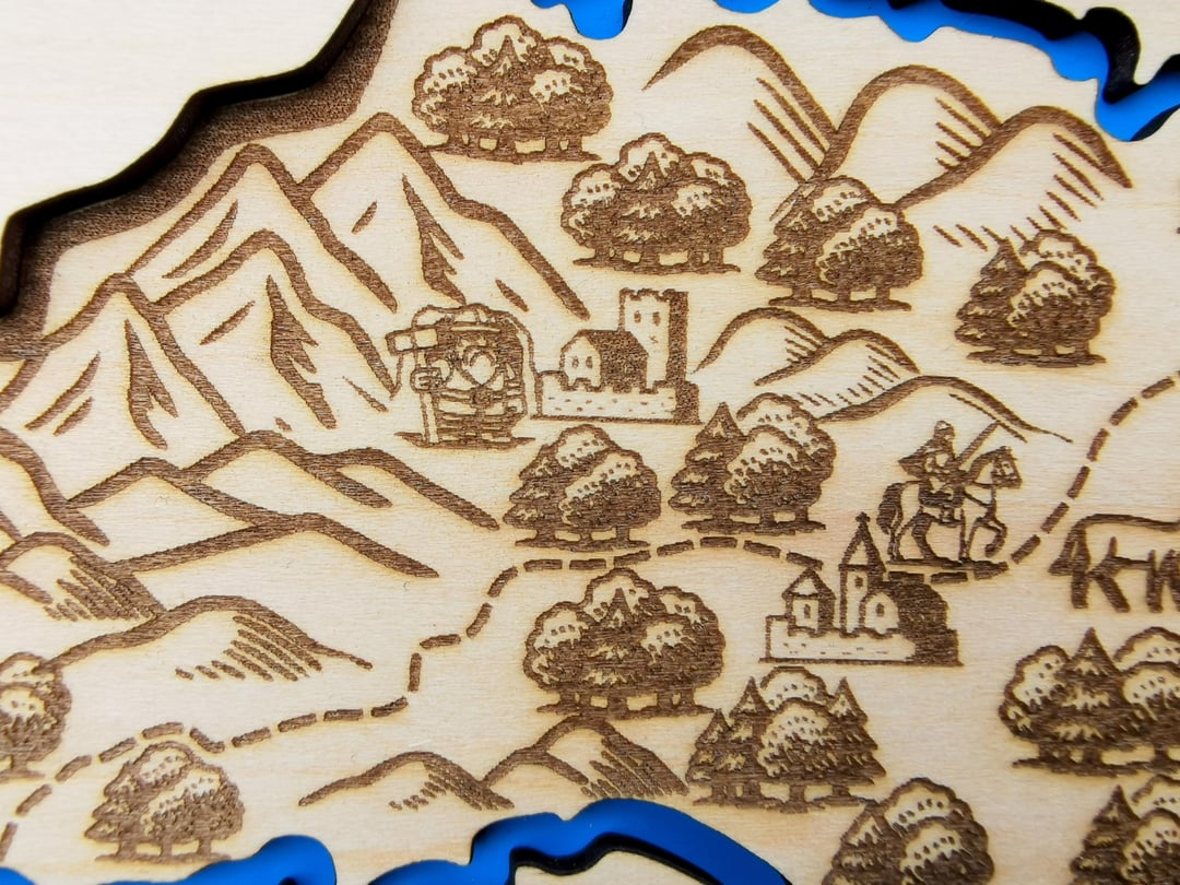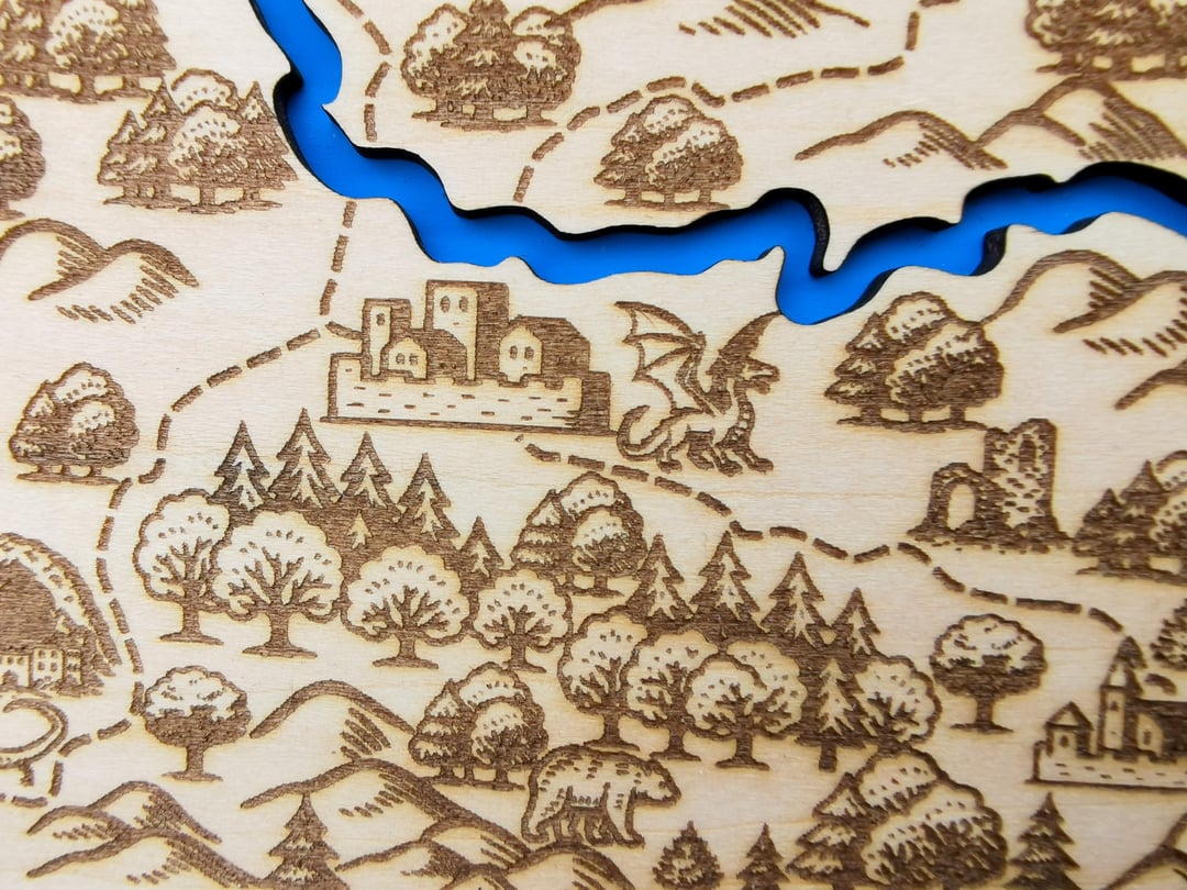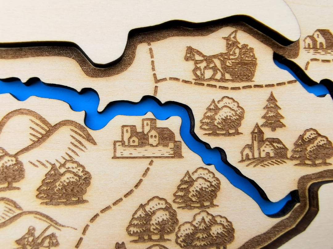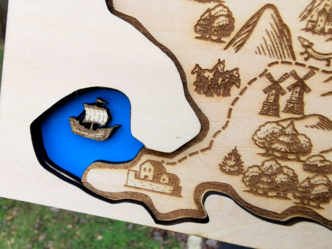 Ich habe die Symbole in Inkscape gezeichnet und dann die Karte per Laser graviert. Es besteht aus drei miteinander verleimten Lagen 3 mm Holz. Die erste Ebene stellt Wasser dar, die zweite eine Karte und die dritte eine Art Cover, das das Gesamtdesign schön abrundet.