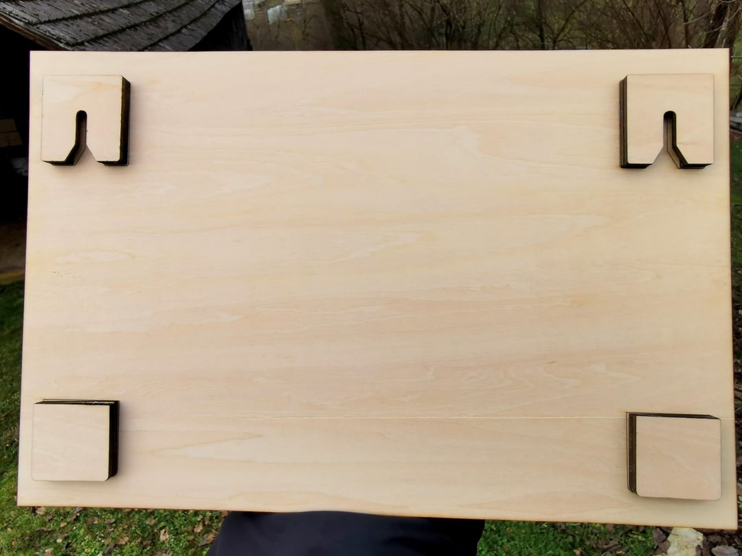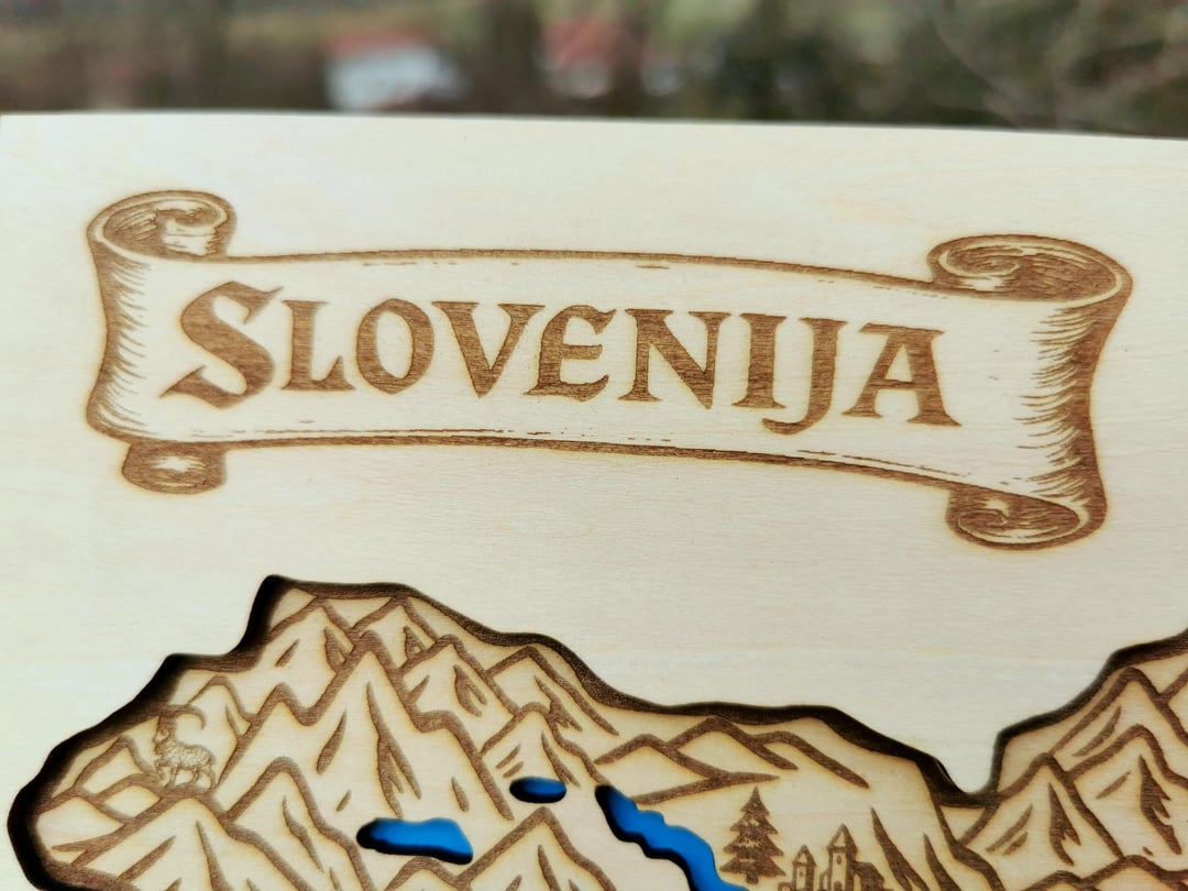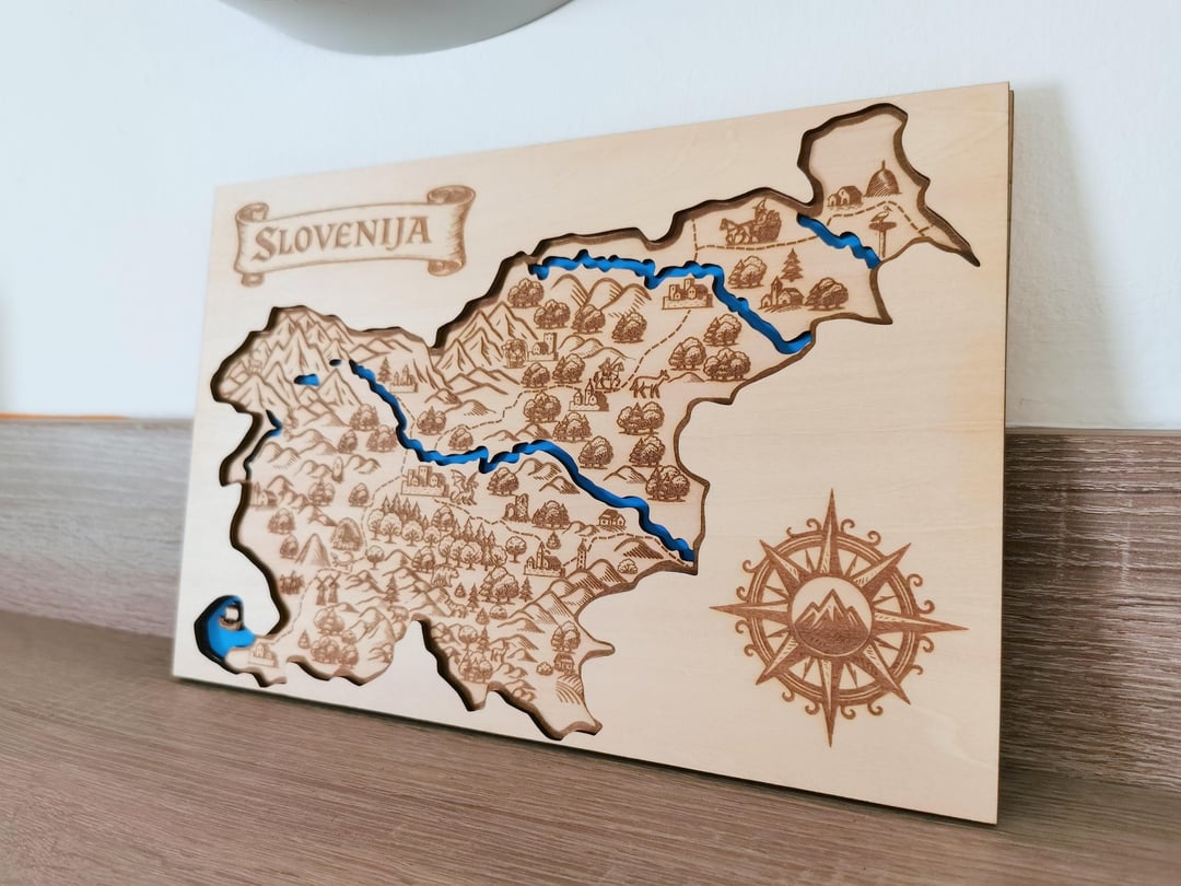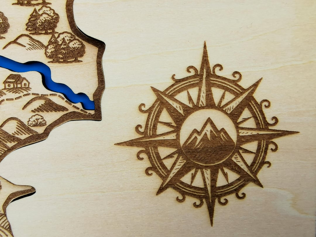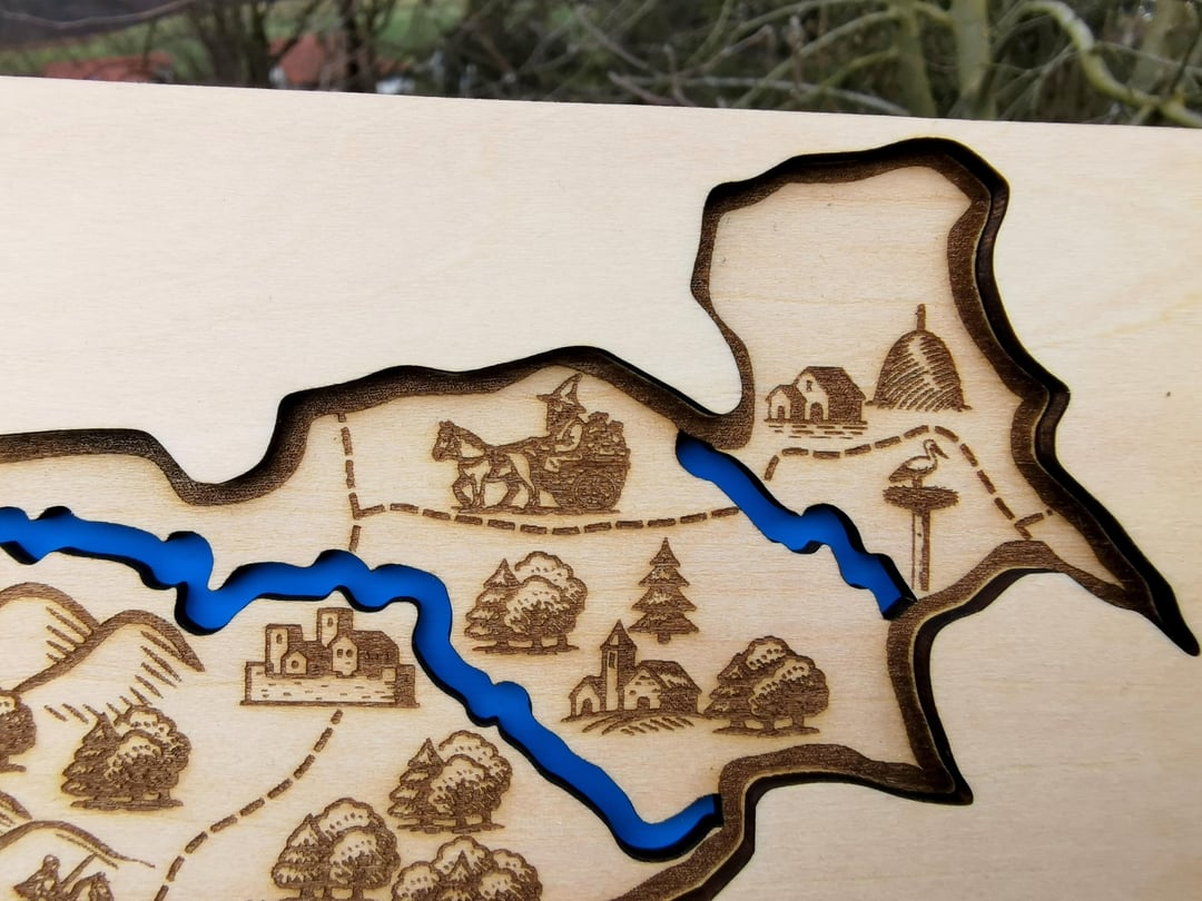 Ich habe die Symbole in Inkscape gezeichnet und dann die Karte per Laser graviert. Es besteht aus drei miteinander verleimten Lagen 3 mm Holz. Die erste Ebene stellt Wasser dar, die zweite eine Karte und die dritte eine Art Cover, das das Gesamtdesign schön abrundet.