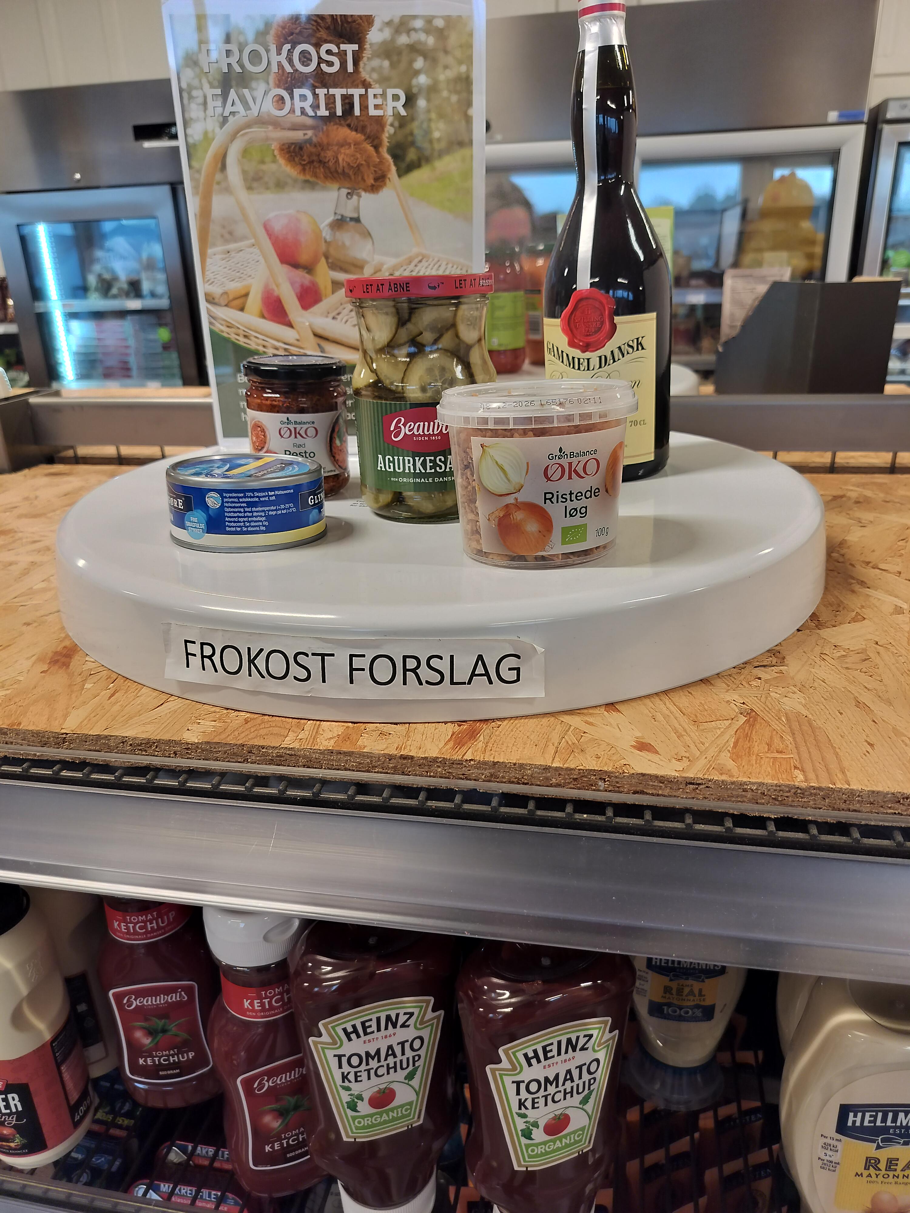 Tun i olie, rød pesto, agurkesalat, ristede løg…. og det bliver skyllet ned med Gammel Dansk…