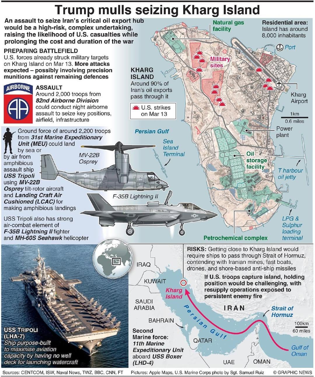 Meanwhile Kharg’s usefulness to Iran would be destroyed if you blew up the one pipeline supplying th island’s sole oil docking terminal. One missile at one pump house and boom. Kharg is a useless pile of rocks. No need to get servicemen killed over it.