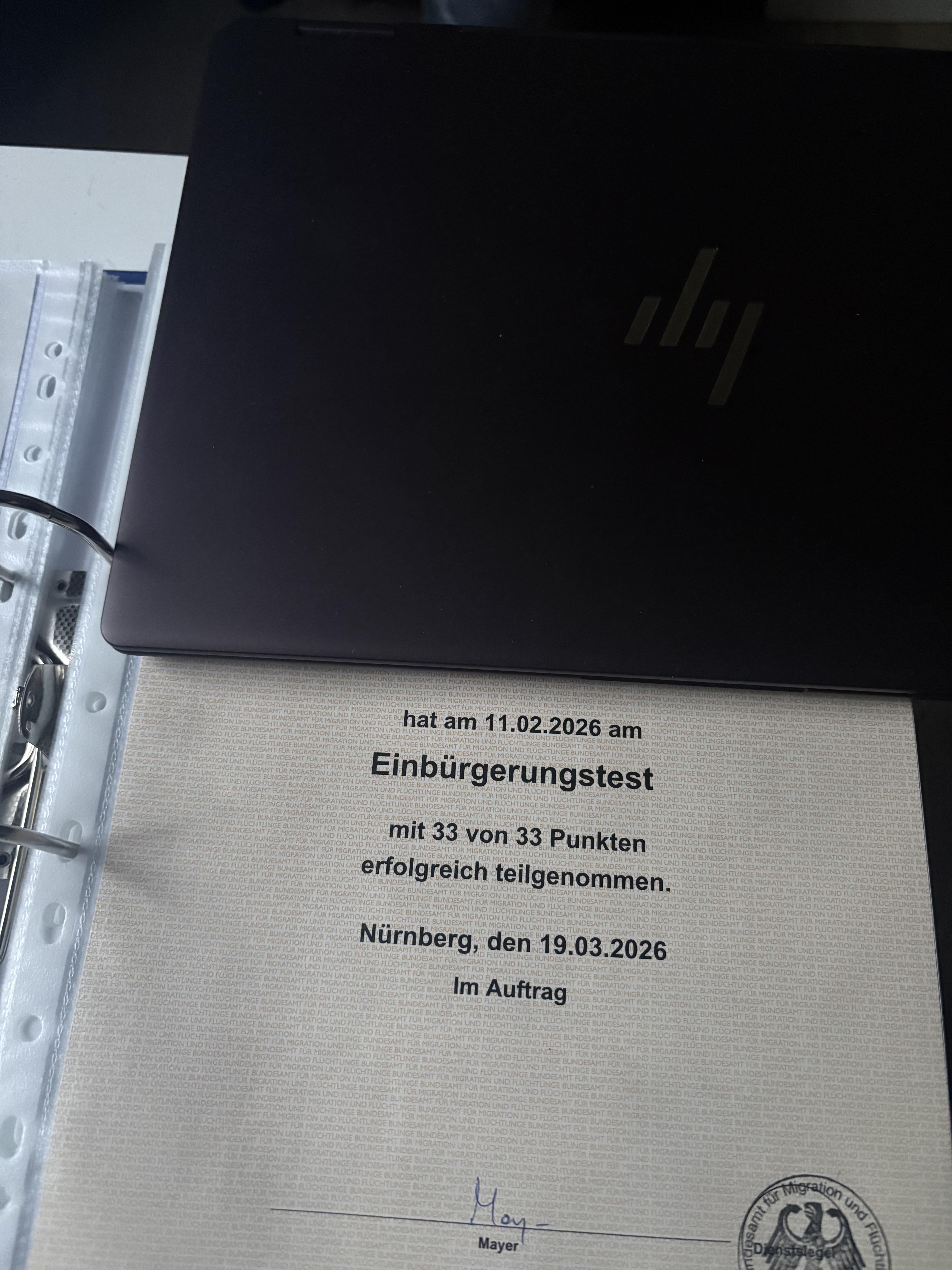 Habe gerade zum Spaß den Einbürgerungstest gemacht und bestanden. Ich lebe schon seit 5 Jahren hier, habe mir aber leider nie viel Mühe gegeben, Sprachen zu lernen. Erst seit einem Jahr lerne ich neben meinem Vollzeitjob Deutsch und jetzt auf A2. Ziel ist es, bis Ende dieses Jahres B1 abzuschließen und die Staatsbürgerschaft zu beantragen. Ich möchte es nur hier teilen.
