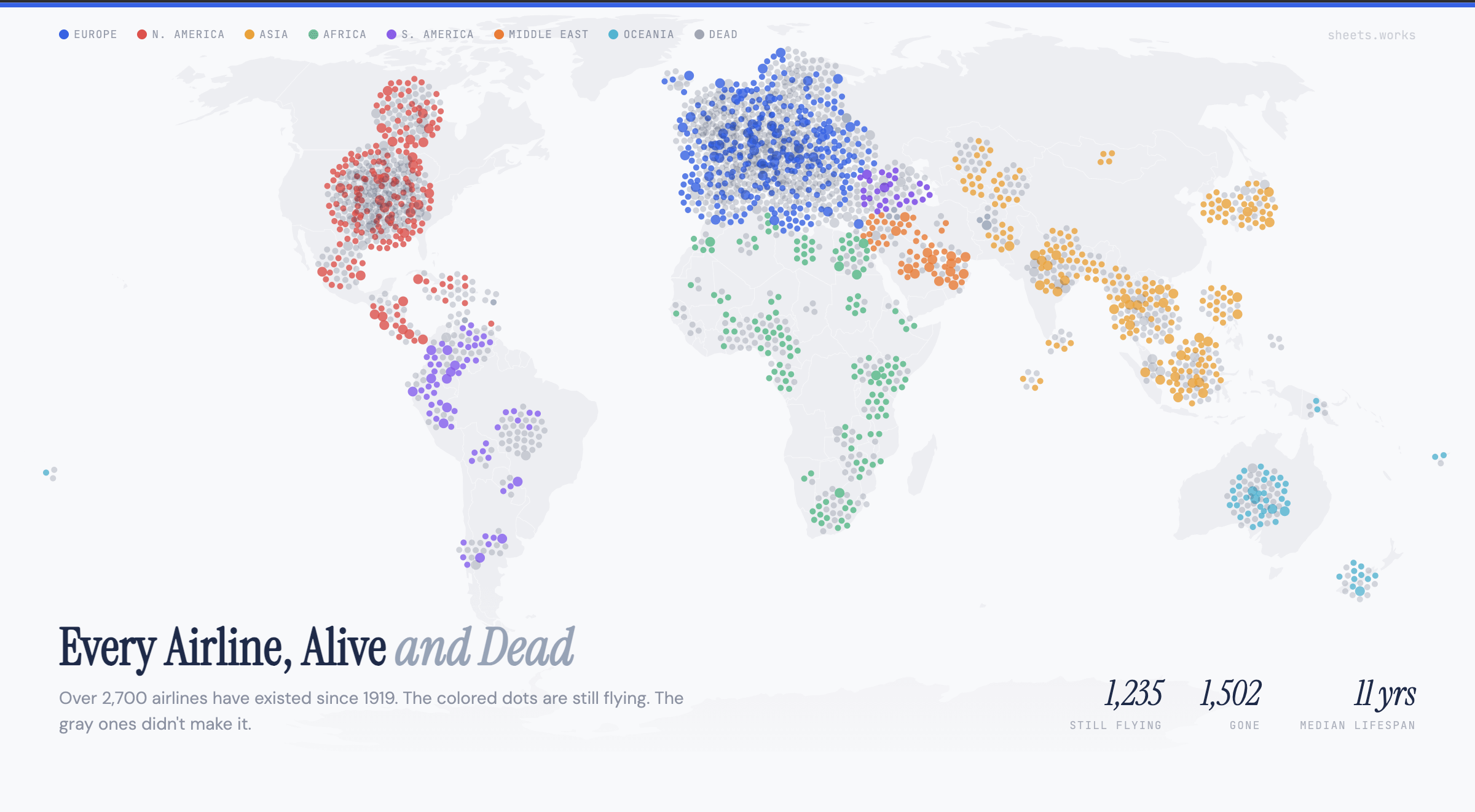 Jeder Punkt steht für eine Fluggesellschaft in ihrem Heimatland. Farbe = Kontinent (blau = Europa, rot = Nordamerika, gelb = Asien, grün = Afrika, lila = Südamerika, orange = Naher Osten, cyan = Ozeanien). Graue Punkte sind Fluggesellschaften, die ihren Betrieb einstellen.