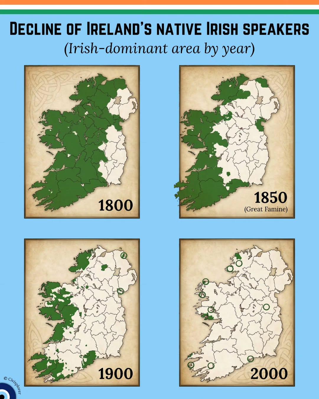 The ironic thing is that the Catholic Church sped up the Irish Gaelic language decline through the National School System imposed by the British, in exchange for Irish Catholic clerics proselytizing Catholicism in overseas British colonies. There wasn’t an Irish Gaelic Catholic bible until after the Second Vatican Council.
