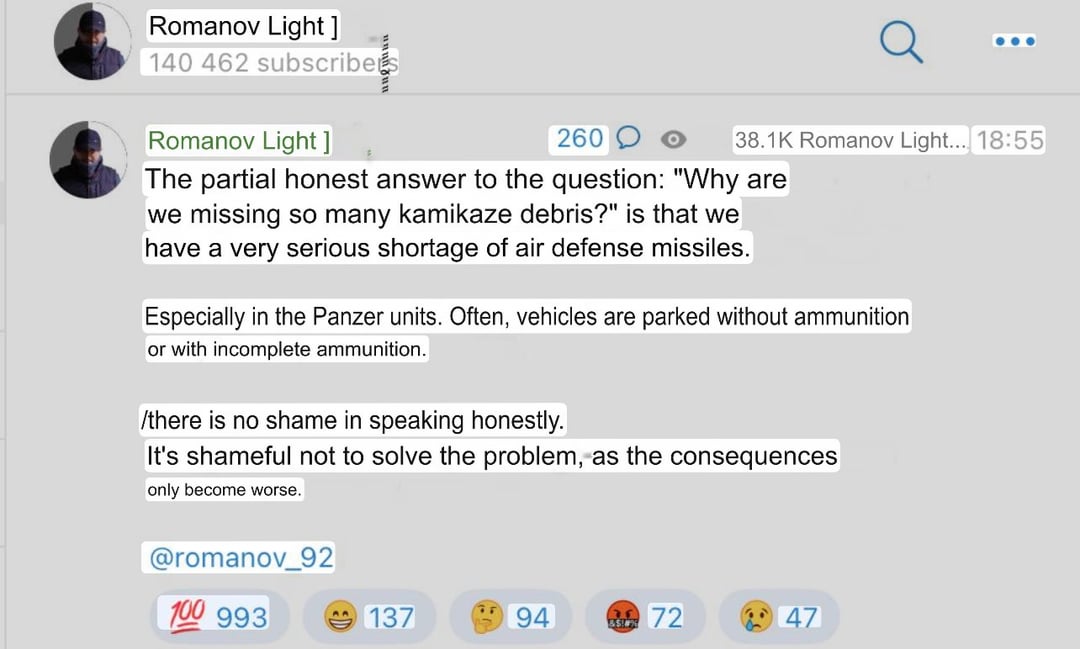 At year 5 of war, this is not what Russia wants to hear. Expanding air defence ammunition capabilities takes at minimum a year and under sanctions it’ll take longer. If Russia has a change of regaining defence of their skies, these expansions should’ve been in full swing since 2023 and in 2025 it required to be further increased and fast tracked to keep up with Ukraine’s increasing capabilities.