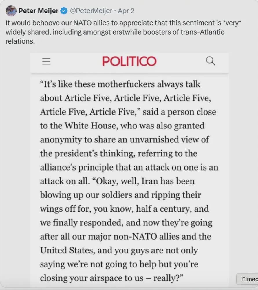 Guys, the President was literally threatening to invade the territory of a NATO country earlier this year, to the point where they had to deploy troops to deter it. That has consequences.