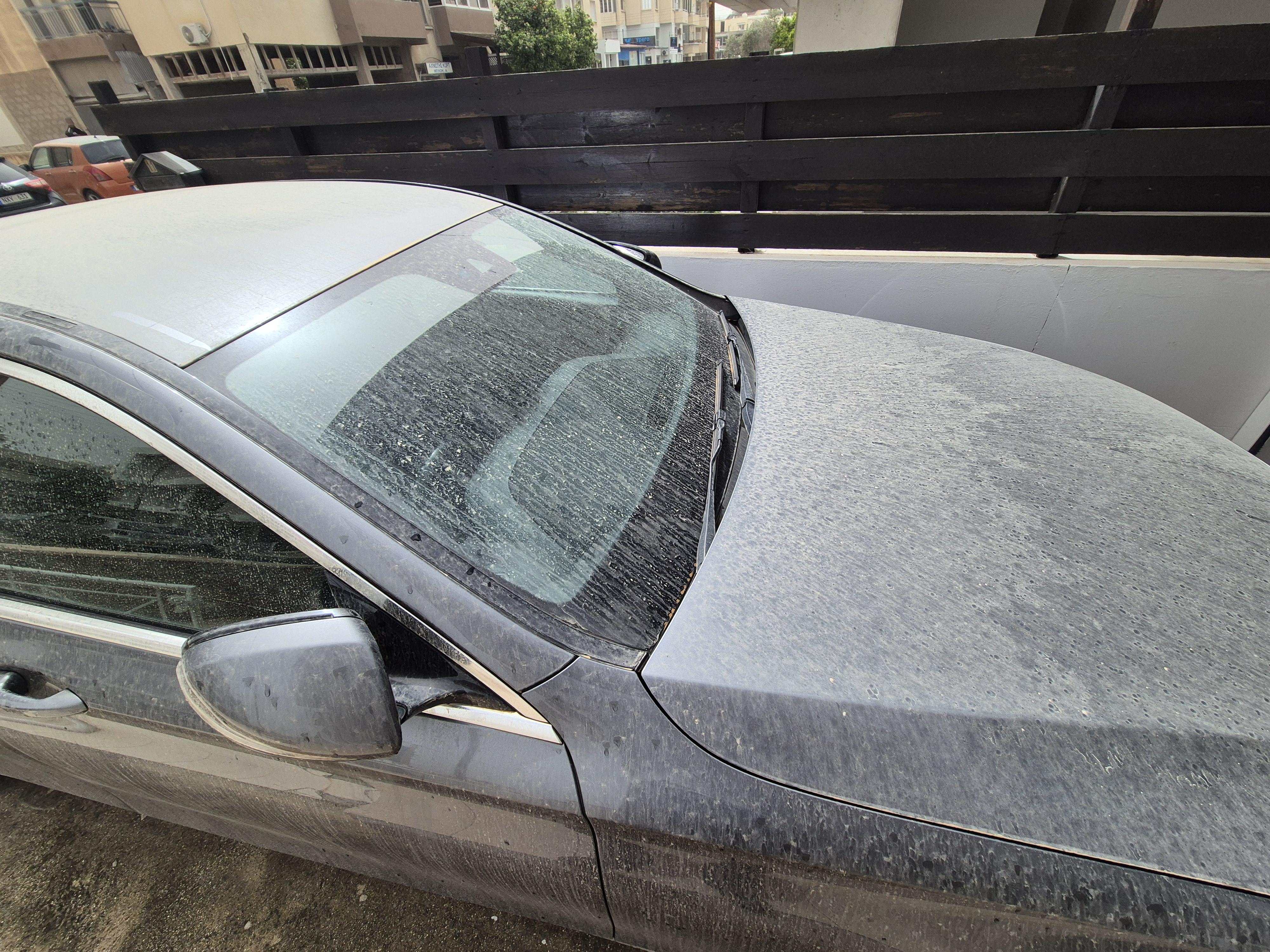 It’s probably safer to go outdoors after the rain than it was before, the rain would have cleared the air from the dust. Unfortunately for you, the evidence is on your car.