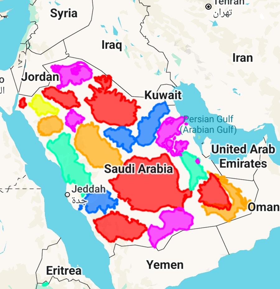 The land area of Saudi Arabia is 2,149,690 km^(2) and the total area of the countries placed within its borders is 1,114,185 km^(2). That leaves 1,005,505 km^(2) empty.