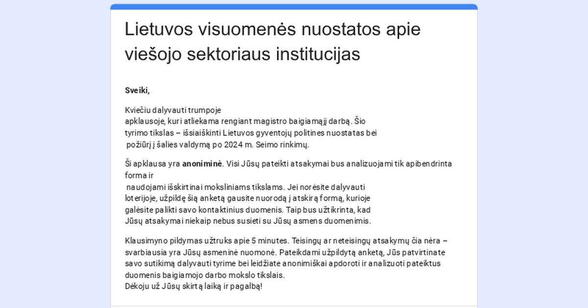 Ich bereite eine Masterarbeit vor und suche Befragte, die sich 5 Minuten Zeit nehmen können. für eine anonyme Umfrage über die heutige öffentliche Stimmung und wie die Litauer die allgemeine Lage im Land einschätzen.
