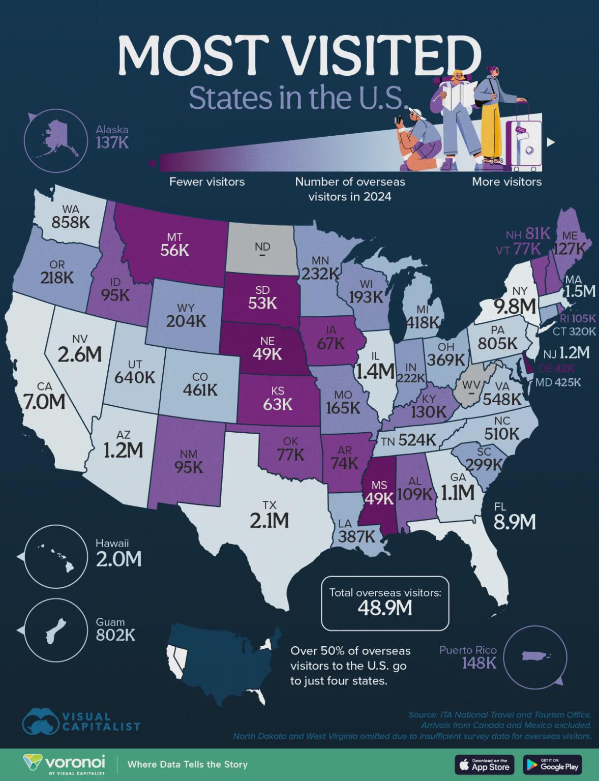 I’m always surprised by the number. 9.8 millions only for New York, 7M for California??? It’s 23M only for Paris in 2025 (half of the tourists).