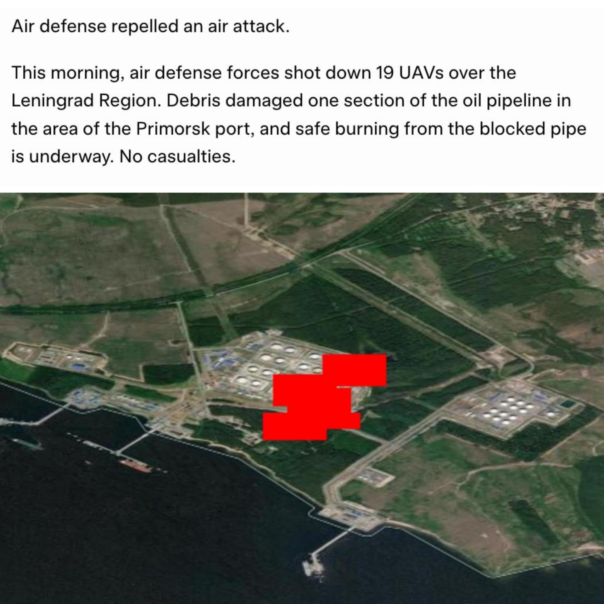 Der Gouverneur der Region Leningrad, Drozdenko, berichtet, dass der Ölhafen Primorsk erneut getroffen wurde, wobei „ein Pipelineabschnitt beschädigt wurde und „sicher brennt“. Unterdessen registriert die NASA nach dem ukrainischen Drohnenangriff gestern Abend einen Großbrand im Ölhafen Primorsk. Es wird angenommen, dass mindestens acht Lagertanks getroffen wurden