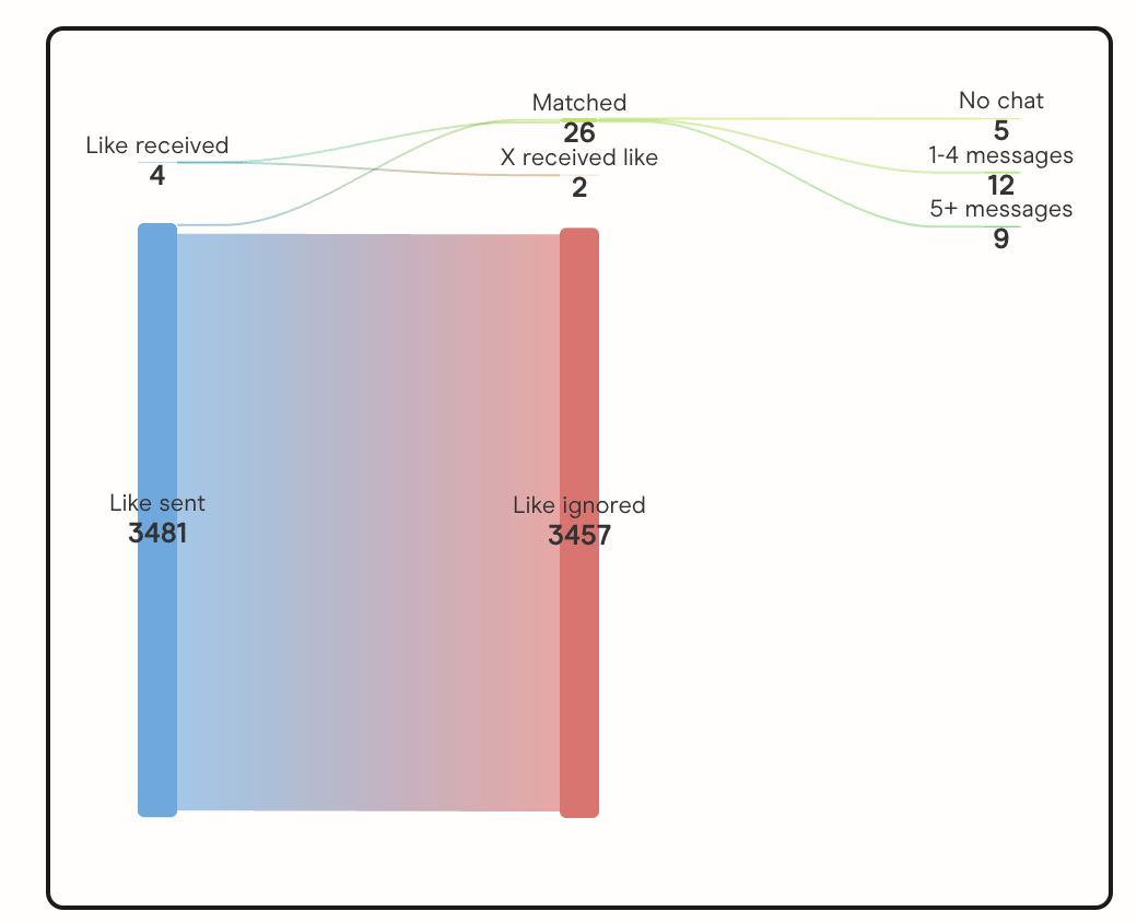 In my experience I swipe right maybe 20% of the time bc those are the ones that meet what I’m looking for. I would be interested to see your total swipes in addition to just the likes.
