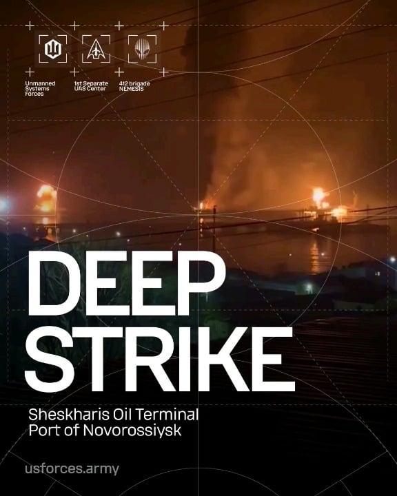 „Operators of the @1usc_army and the 412th „Nemesis“ USF Brigade, alongside other Defense Forces components, struck the „Sheskharis“ oil terminal — the largest on the Black Sea and in southern russia.