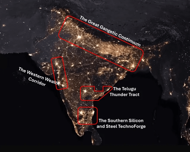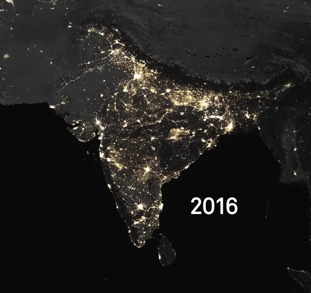 The swathes that are not illuminated on the left are the Western Ghat Mountains and the Thar Desert. The one in the east is the Dandakaranya Forest if anyone is wondering.