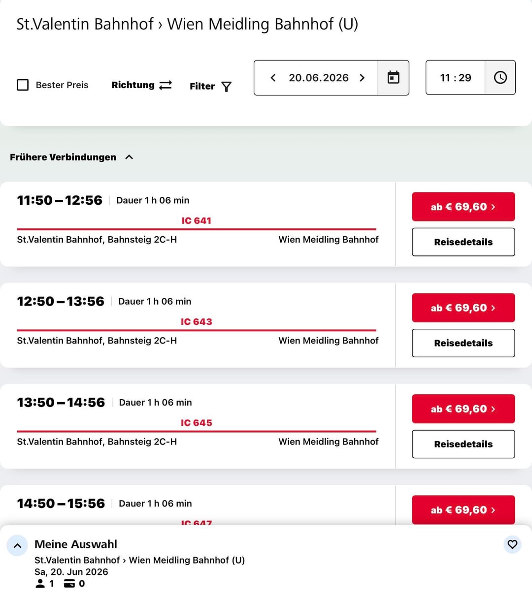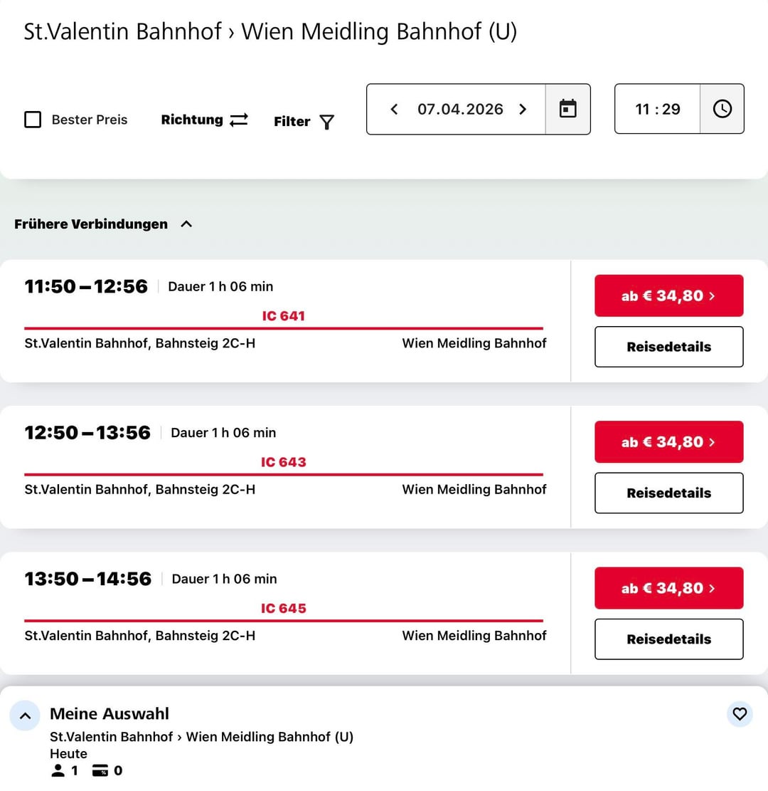 Vergleich wenn ich jetzt ein Ticket von St. Valentin nach Meidling kaufe (ca. 1h Fahrt!) zahlt man 34,80€. Das ist zwar schon viel aber mit Vorteilscard noch okay. Ab ca. Juni kostet es auf einmal das doppelte. Ist das ein Fehler oder erhöhen die schon wieder die Preise? 😳