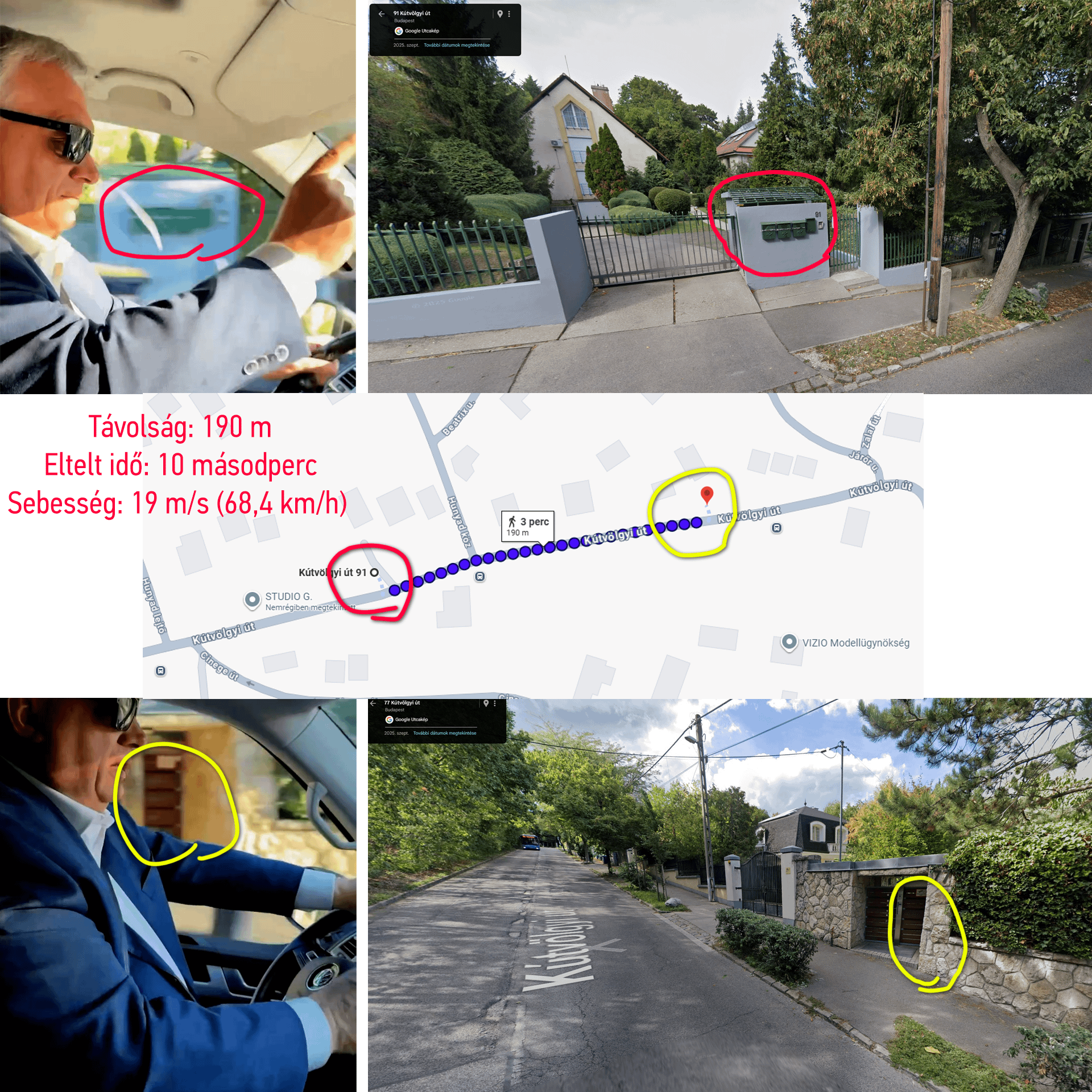 Es gelang mir, den Ort zu identifizieren, und durch das Herausschneiden eines exakten 10-Sekunden-Ausschnitts aus dem Video konnte ich die Geschwindigkeit leicht berechnen, die tatsächlich die zulässige Höchstgeschwindigkeit von 50 Kilometern pro Stunde um 36,8 % überschreitet, was eine Geldstrafe von 50.000 HUF und 4 Strafpunkte bedeutet.