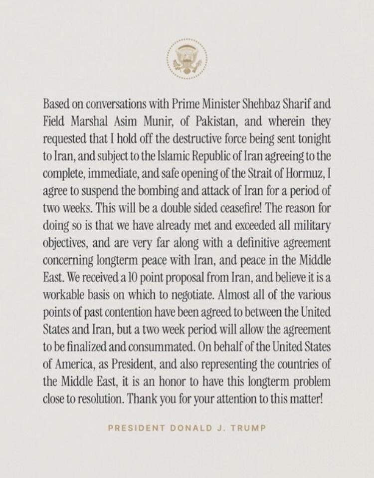 Mesajı yanlış okumuşsunuz. Ateşkes yok. Burada Trump yapacağı elektrik ve su santralleri ve altyapı saldırılarını iki hafta Pakistan ve Suudi Arabistan liderleri ile konuştuktan sonra erteleyeceği yazıyor. İran ile herhangi bir iletişim gercekleştirilmemesine dahil İran 20 dakila önce İsrail’e yeni bir füze saldırısında bulundu.