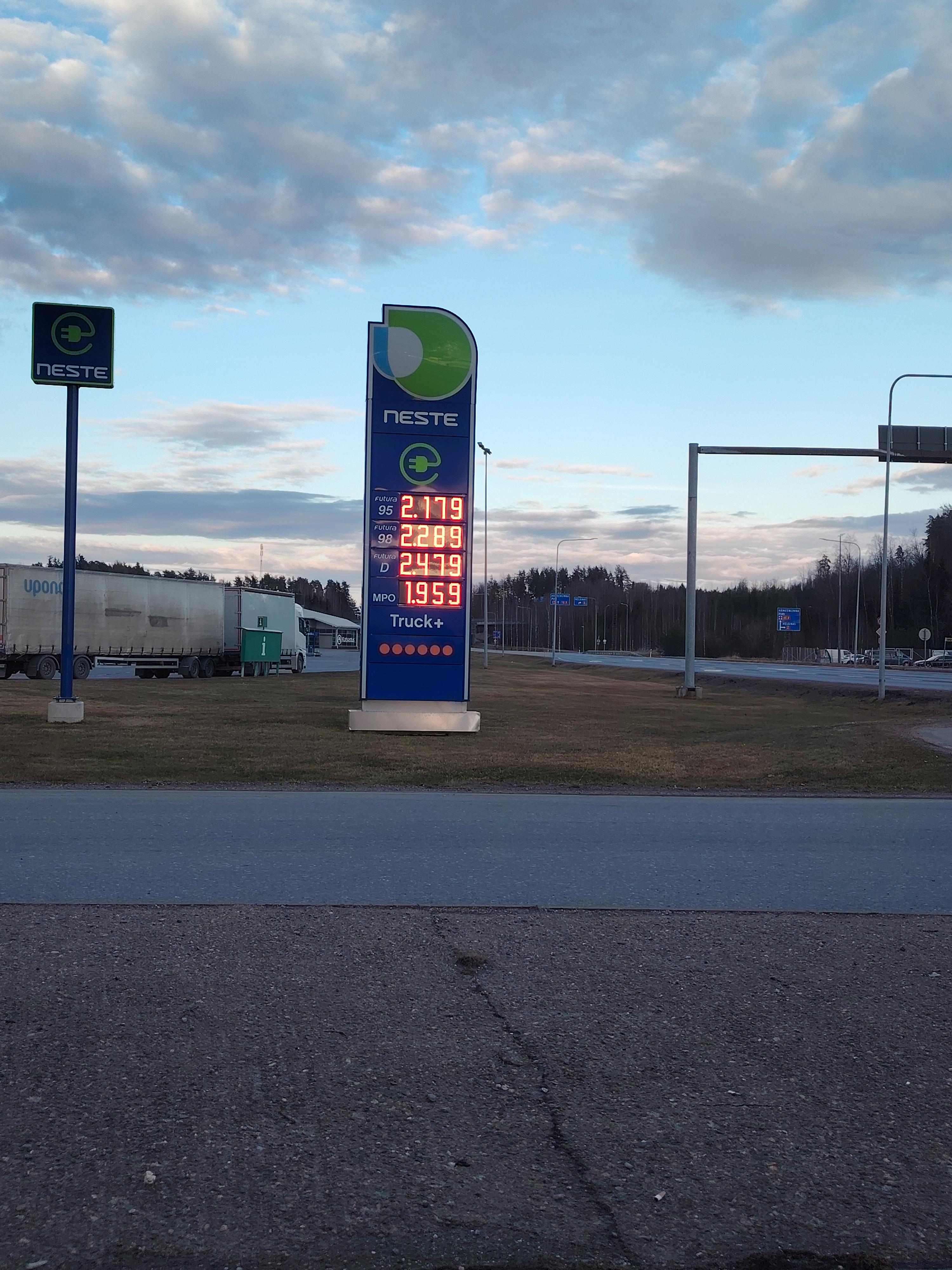 Lappeenranta yesterday: 2.184€ for 95, 2.294€ for 98, and 2.484€ for D. I found the cheapest one. Other gas stations were +0.10€ per litre.