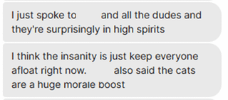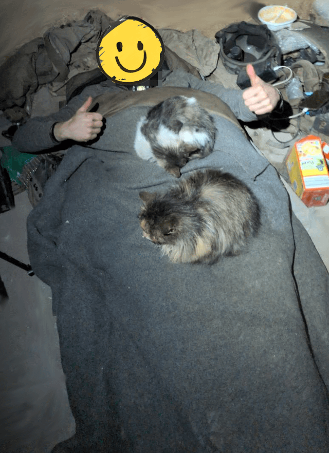 Der Titel sagt eigentlich alles: Der Teamkollege eines guten Freundes sitzt seit Wochen an seinem Platz fest, weil es für niemanden sicher ist, hineinzugehen und ihn zu evakuieren. Mein Freund erzählte mir heute Morgen, dass die Jungs in bester Stimmung seien und die Katzen sehr gut für die Moral seien.